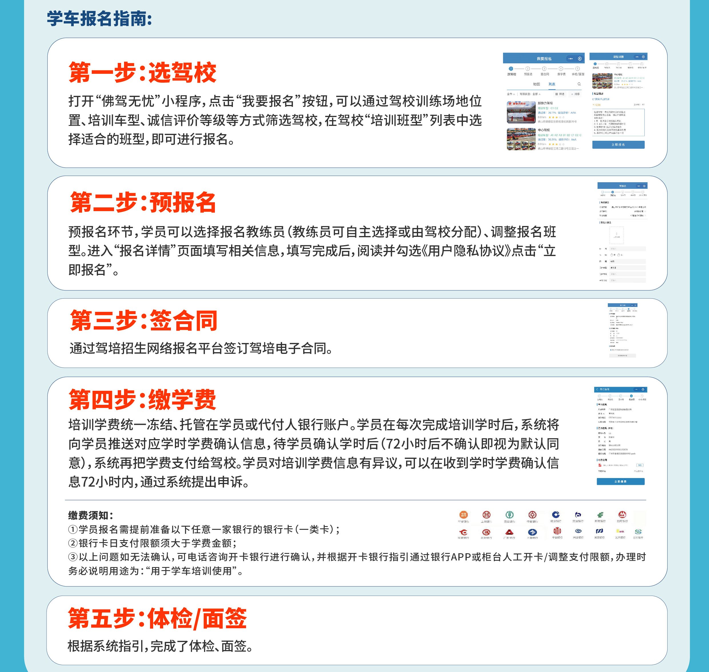 令学员安全感满满的还有学费托管、先学后付等服务。该平台实现“五个统一”,即统一网上报名入口、统一网上签订合同、统一免费资金托管、统一先学后付、统一服务评价体系。学员报名后,学费统一免费托管在本人或代付人的银行账户,按照培训所学学时逐批划拨,划拨信息需学员确认后,才划拨给驾校,确保每一次培训、每一笔学费支出都有迹可查,收获广大驾校及学员肯定。