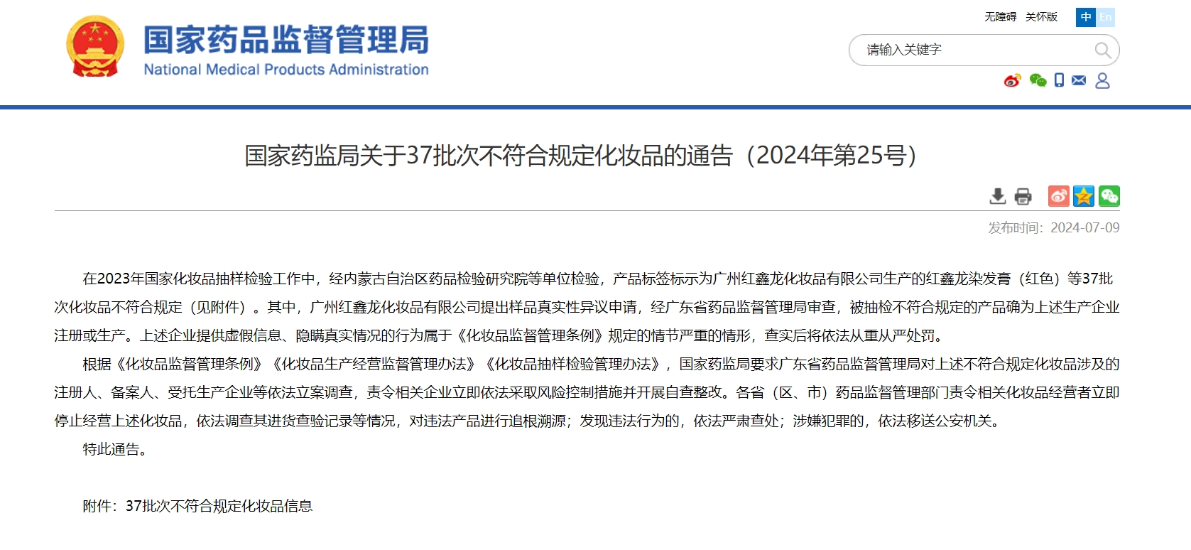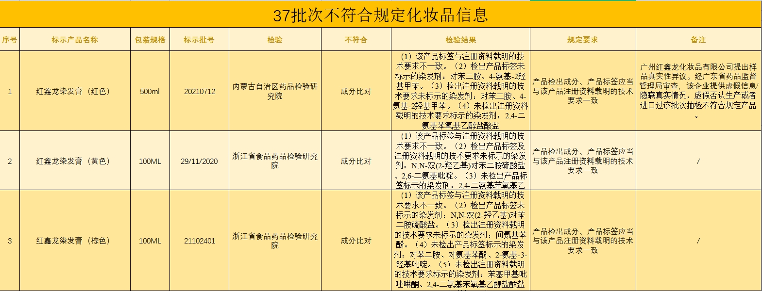 值得注意的是,广州红鑫龙化妆品有限公司对标示批号为20210712的红鑫龙染发膏(红色)提出样品真实性异议申请。经广东省药品监督管理局审查,被抽检不符合规定的产品确为上述生产企业注册或生产。上述企业提供虚假信息、隐瞒真实情况的行为属于《化妆品监督管理条例》规定的情节严重的情形,查实后将依法从重从严处罚。