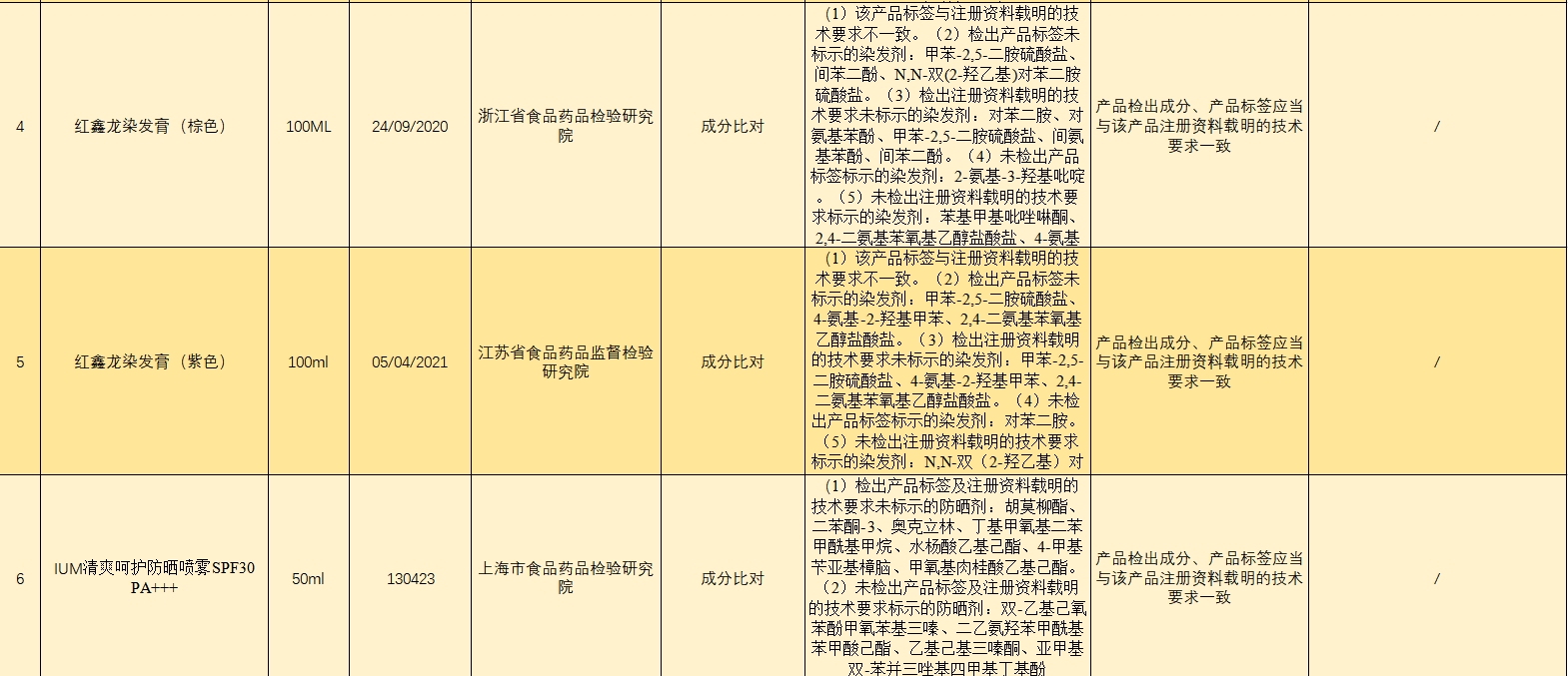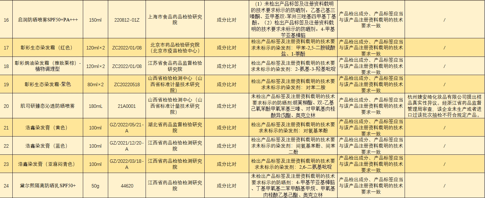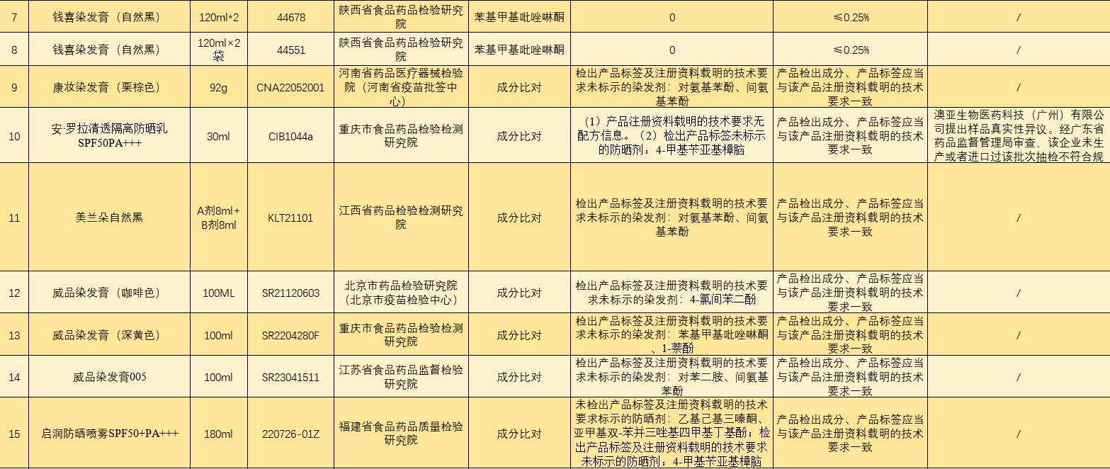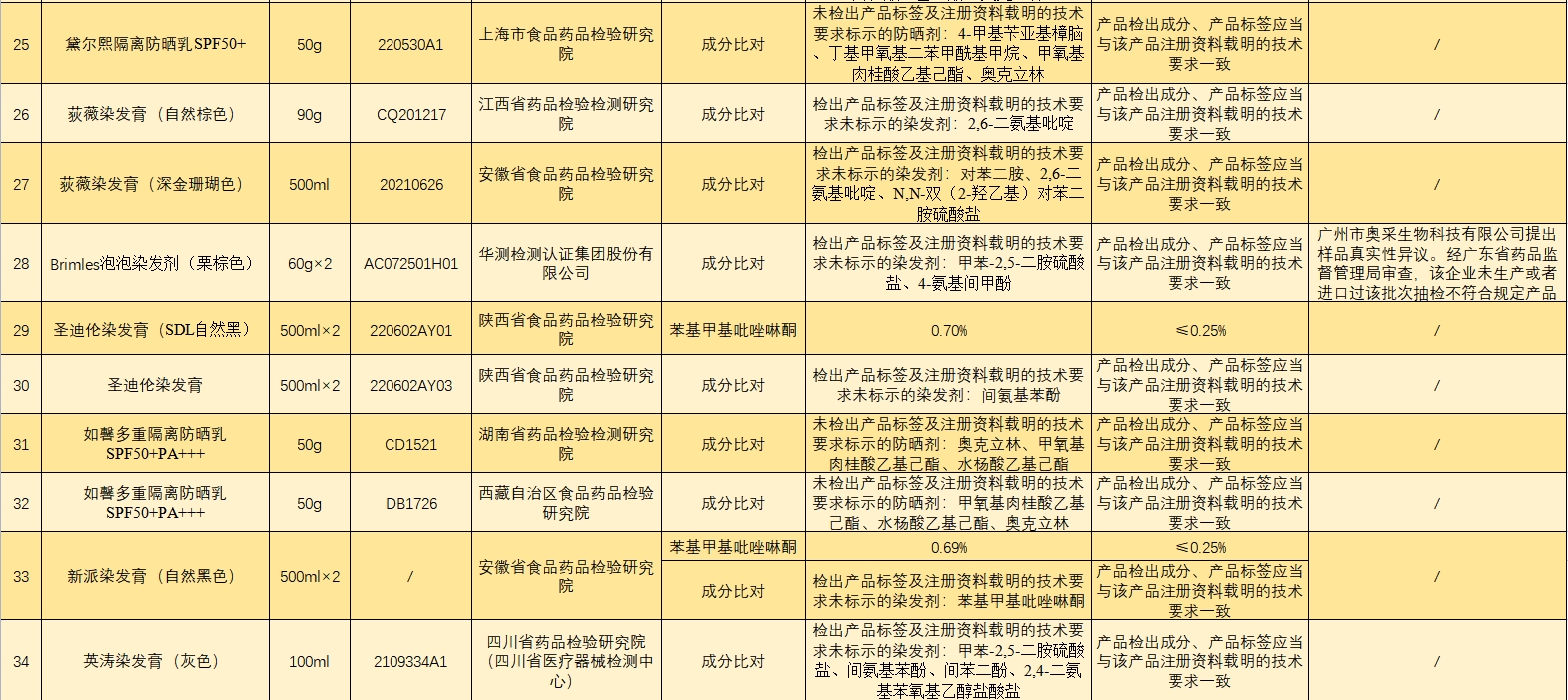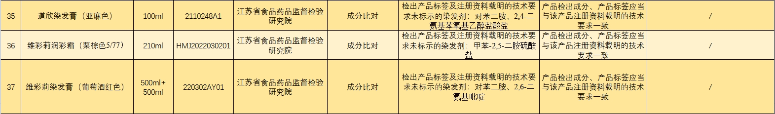 此次通报不合格的28批次染发产品分别是红鑫龙染发膏(红色)、红鑫龙染发膏(黄色)、红鑫龙染发膏(棕色)、红鑫龙染发膏(紫色)、钱喜染发膏(自然黑)、康妆染发膏(栗棕色)、美兰朵自然黑、威品染发膏(咖啡色)、威品染发膏(深黄色)、威品染发膏005、彰彩生态染发霜(红色)、彰彩焗油染发霜(雅致栗棕)-植物调理型、彰彩生态染发霜-紫色、浩鑫染发膏(黄色)、浩鑫染发膏(蓝色)、浩鑫染发膏(亚麻闷青色)、荻薇染发膏(自然棕色)、荻薇染发膏(深金珊瑚色)、Brimles泡泡染发剂(栗棕色)、圣迪伦染发膏(SDL自然黑)、圣迪伦染发膏、新派染发膏(自然黑色)、英涛染发膏(灰色)、道欣染发膏(亚麻色)、维彩莉润彩霜(栗棕色5/77)、维彩莉染发膏(葡萄酒红色)等。