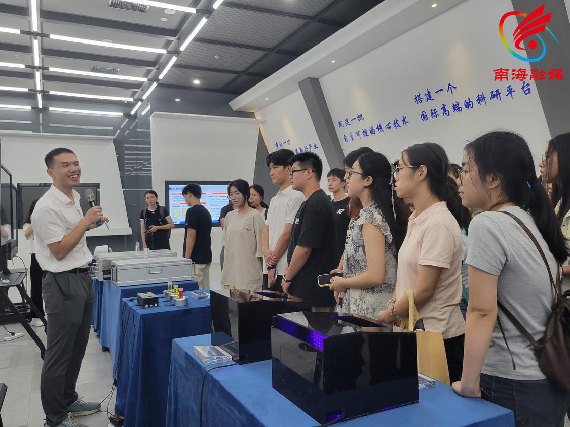 第二站季华实验室,高校学子与科研工作者就学业、工作、科研等方面开展热烈讨论。在讲解员的详细介绍下,学子们从半导体材料到机器人控制,从光学仪器到量子医学,从新型材料到模具设计等方面进行了学习了解,加深了对南海及季华实验室科创条件、科研能力的认知。