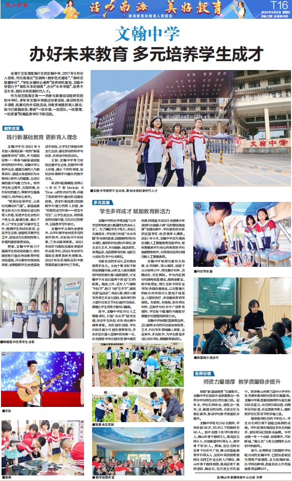 作为现在南海区唯一一所参与新基础实验研究的初中学校,多年来文翰中学通过探索实践,建设特色校本课程、拓展校内外实践活动,探索多维度的育人路径,如今已颇具成效,朝着“一流环境、一流团队、一流管理、一流质量”的高品质学校不断迈进。