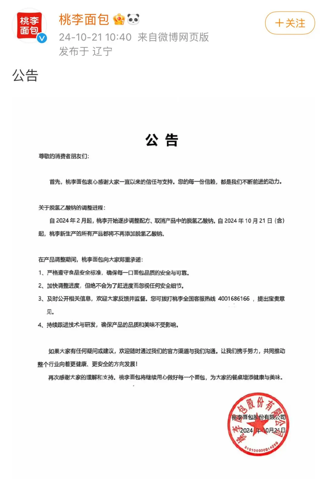 不少食品品牌目前正在为适应新规做准备。10月21日,桃李面包官方发布声明称,自2024年2月起,企业开始调整配方,取消产品中的脱氢乙酸钠,并称自今年10月21日起,企业生产的所有产品都将不再添加脱氢乙酸钠。记者在走访过程中,也有豪士面包等品牌的工作人员在替换新批次的面包蛋糕。