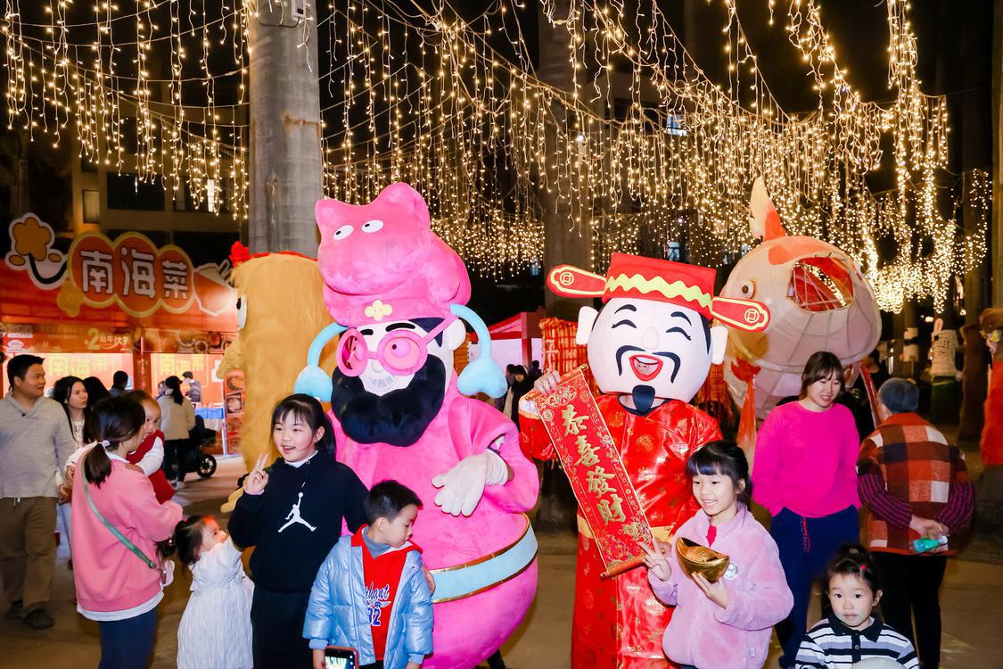 其中值得一提的是,水上花市与人气国潮文化IP“四喜财神”的联名合作——高达6米的财神迎福装置与2.5米的互动财神装置,凭借其萌态可掬的形象和吉祥美好的寓意,迅速跃升为游客们的热门拍照打卡之地。游客们在此不仅可以轻拍财神肚、抽取财运卡,还能与财神击掌互动,寓意着与财神“一拍即合”,让游客们在一片欢声笑语中喜迎新春佳节。