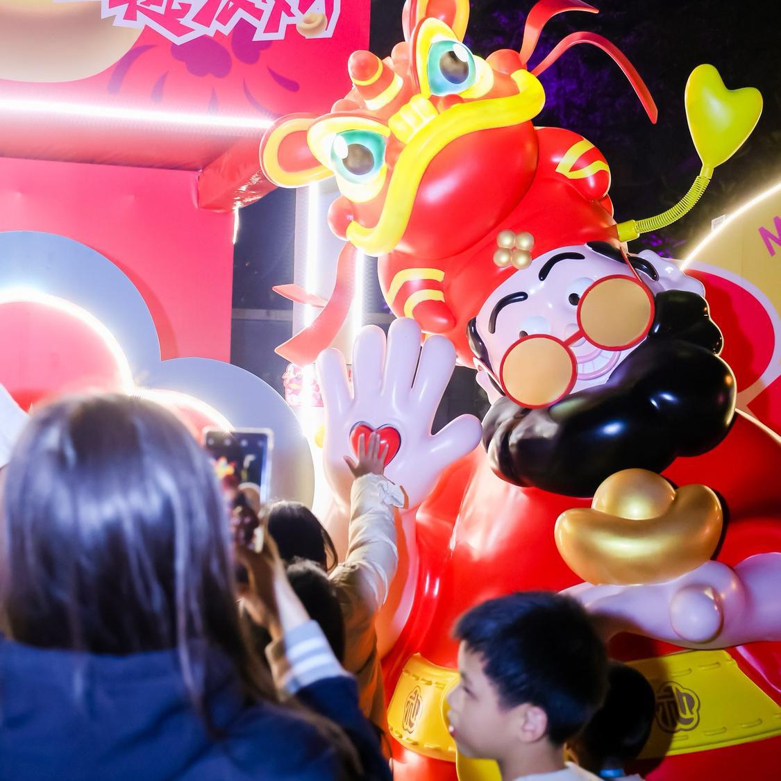 2.5米高的互动财神装置,吸引了众多小朋友和大人与其击掌打卡。