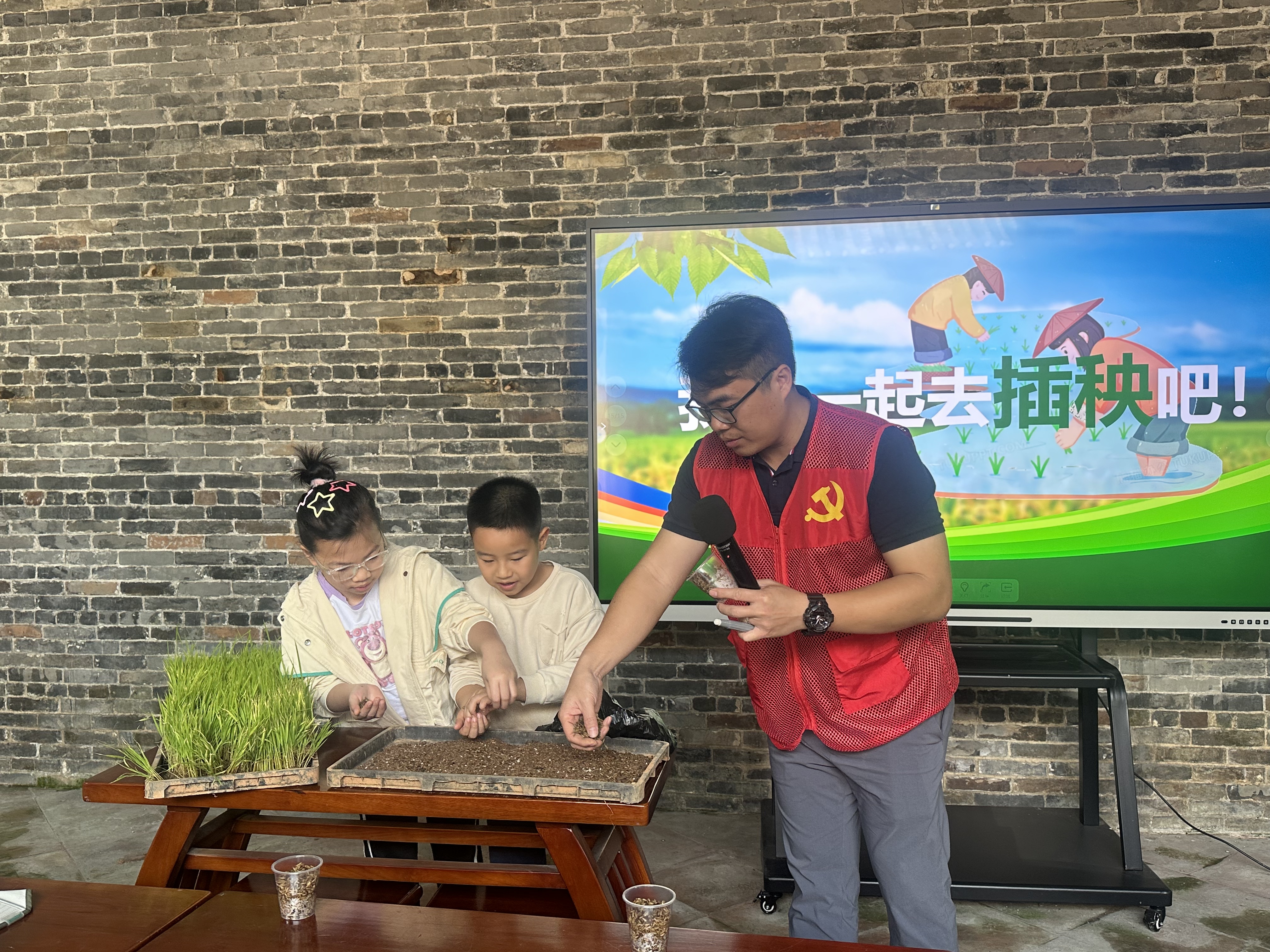 讲座后,工作人员还现场指导孩子们如何培育秧苗,孩子们积极参与体验,并捧着自己刚刚培育的秧盘拍照。