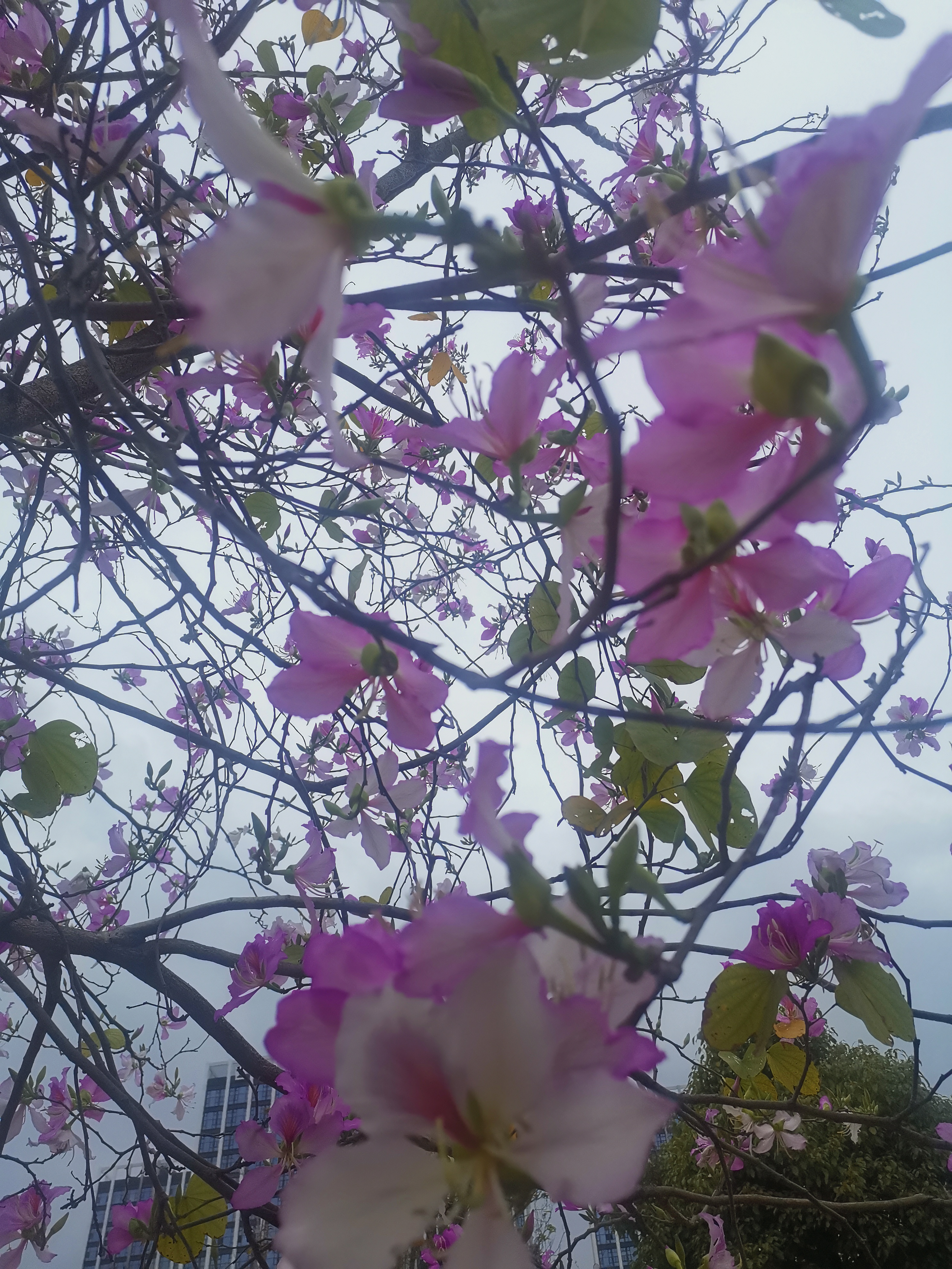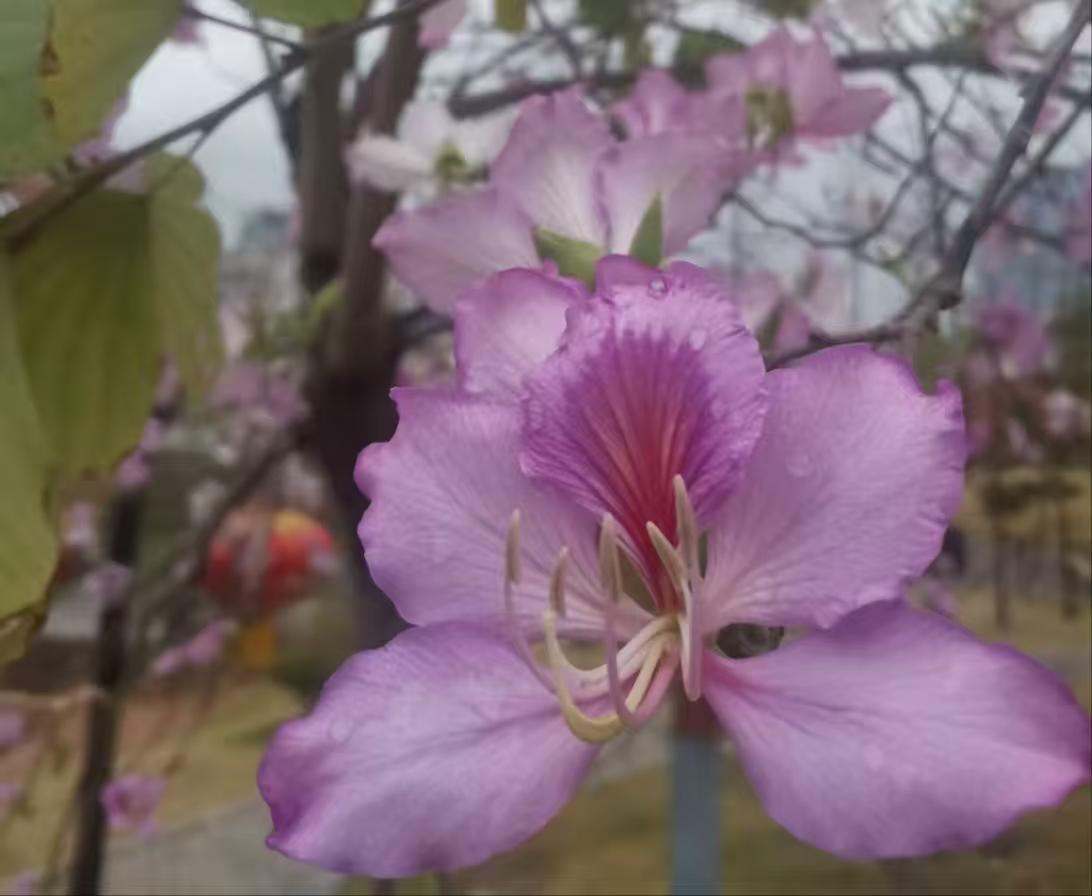 宫粉紫荆是偏白的粉色,不张扬,远看淡粉色的一团,近看却显得花朵稀疏,所以更适合远观。