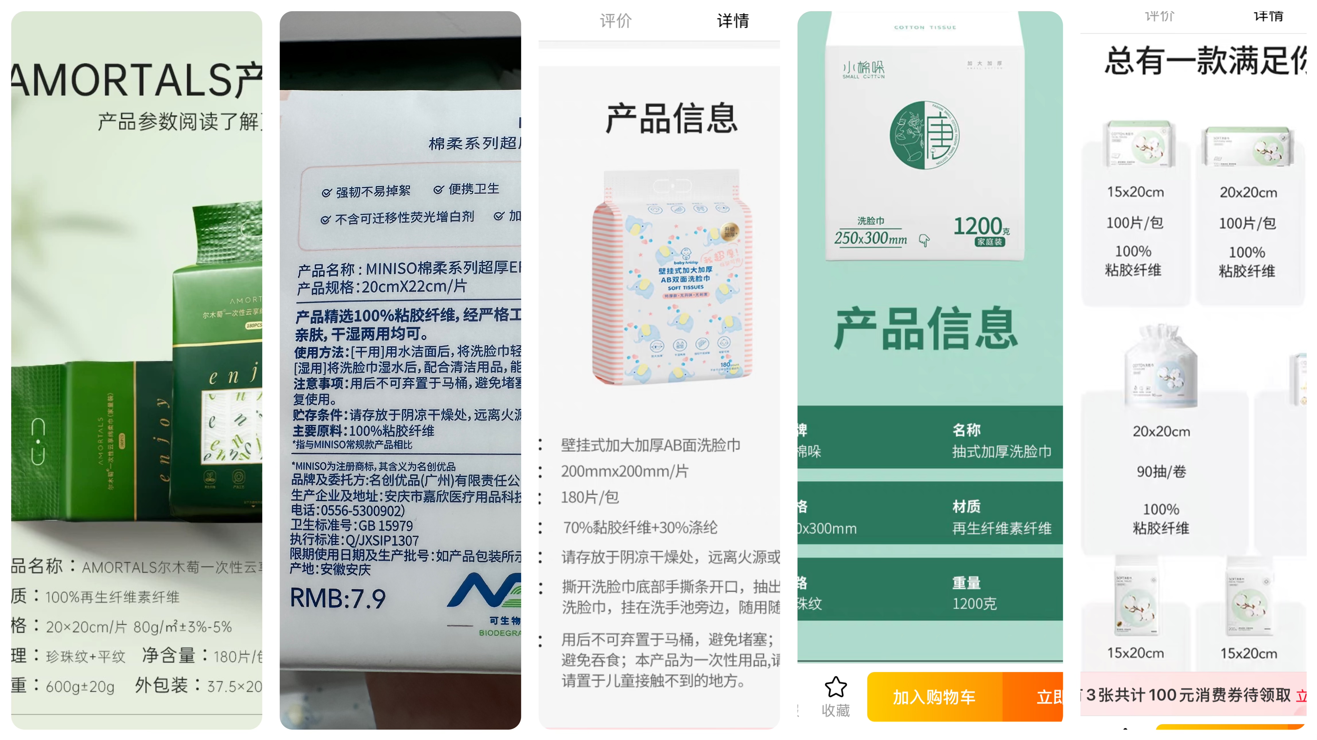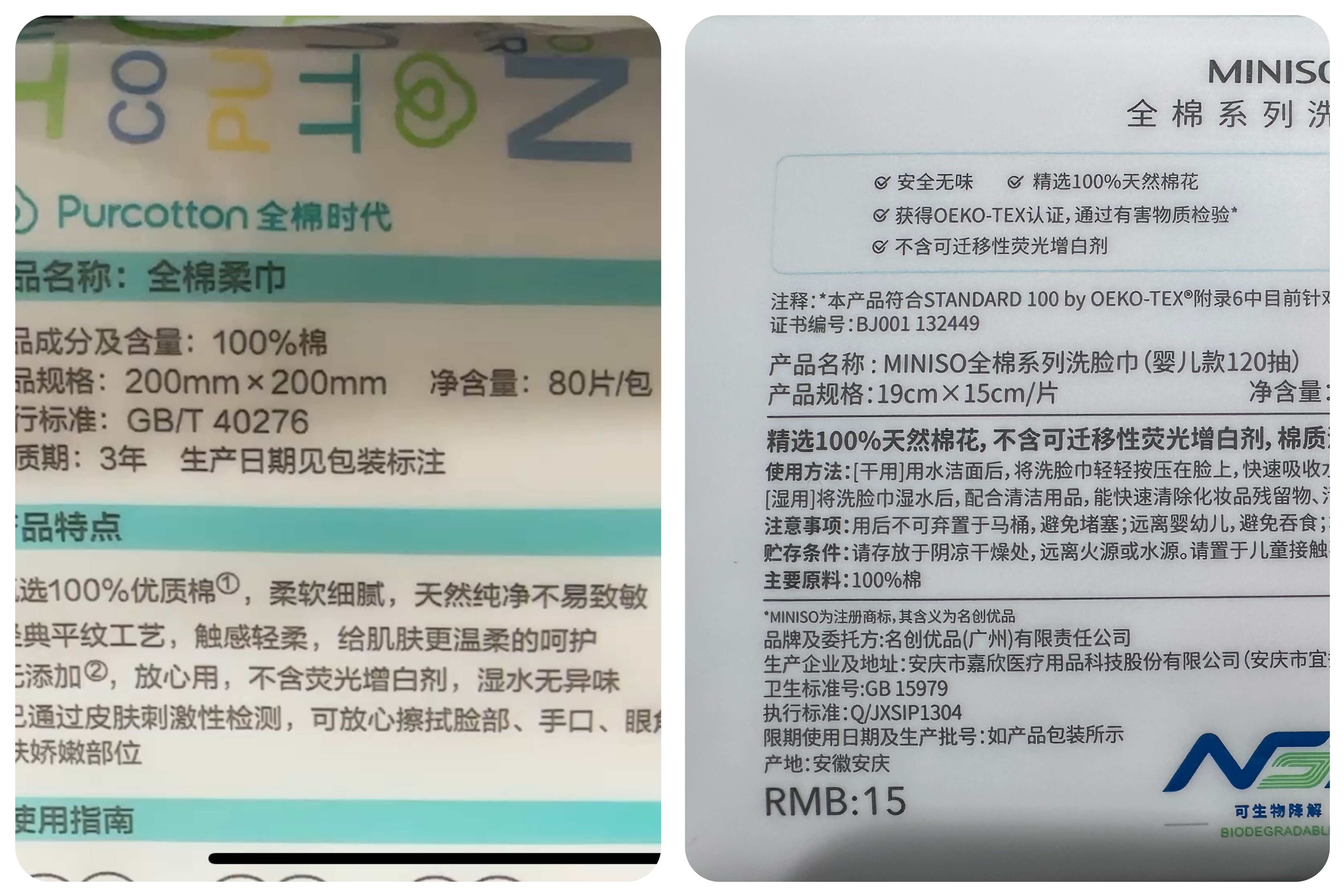 记者观察发现,在柔巾产品的标签上,“棉柔巾”产品会标注100%棉,而“绵柔巾”则一般会出现“粘胶纤维”、“涤纶”、“再生纤维素纤维”等字眼。记者在某电商平台上搜索销量靠前的柔巾产品,发现部分品牌相同抽数和规格对比的话,全棉的柔巾价格大约高两到三成。