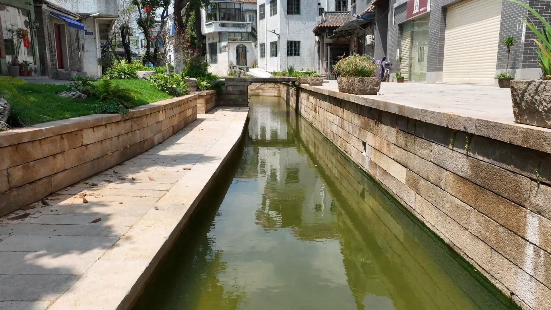 绕过碧江金楼,走进“广东省历史文化街区”村心大街,映入眼帘的不再是停满车辆的混凝土街道,而是一条清澈见底、碧水静流的河涌——按照清代村心涌的线位、形态和样式修筑的驳岸、石阶,复现沿岸古韵风貌,为人们提供了亲水平台;以村民口述史及历史故事为蓝本设计的步行桥、埠头等构筑物,串联起碧江金楼、祠堂、砖雕照壁、民居等沿岸建筑。