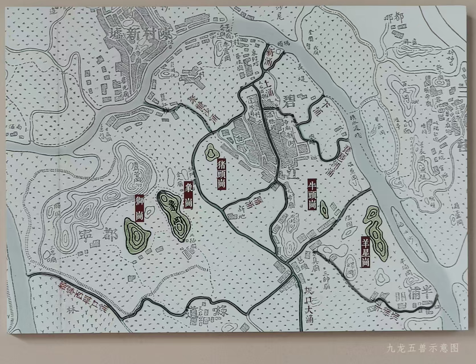 据清咸丰《顺德县志》记载,碧江村始建于汉代,于南宋初年大规模建村。南迁先民依托独特的地理环境沿河聚居、兴修水利、围垦造田,形成“五兽当关,九龙入洞”的空间格局,构建“藏风聚气、山环水抱”的理想人居环境。其中,“五兽当关”指环绕在村落周边的五座兽形山岗拱卫碧江;“九龙入洞”指村内水网密布,九条河涌纵横交错。