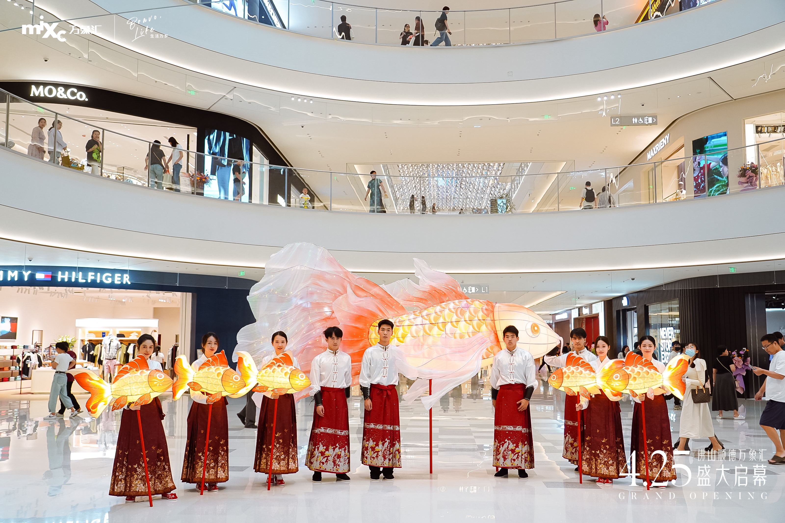 在消费体验的革新之外,顺德万象汇更致力于打造城市文化会客厅。开业期间推出的「游园入梦」艺术特展,以金属镜面重构镬耳墙、趟栊门等岭南建筑符号,俄罗斯艺术家Leonid的装置作品《私人月亮》悬浮于中庭,形成传统与现代的时空对话。非遗快闪活动中,香云纱舞者以飘逸绸缎演绎桑基鱼塘的农耕记忆,鱼灯艺人则用现代光电技术重现“一船灯火一船歌”的水乡夜景。