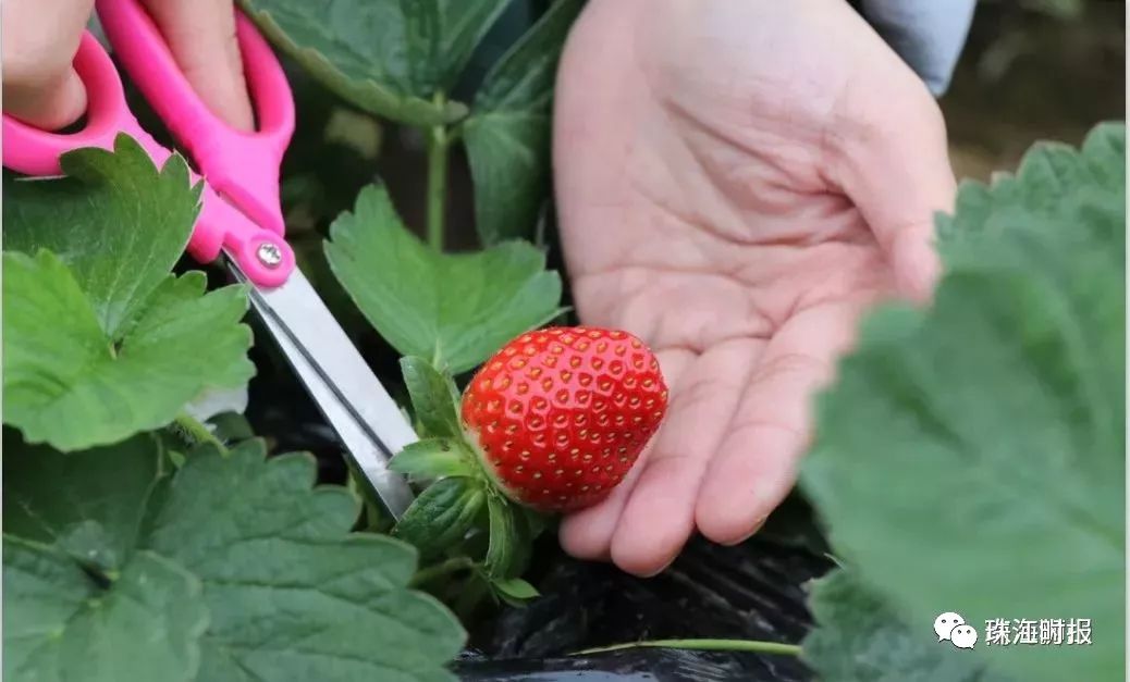 采摘贴士:摘草莓时用剪刀从果柄处剪断,不要用力拉扯哦。