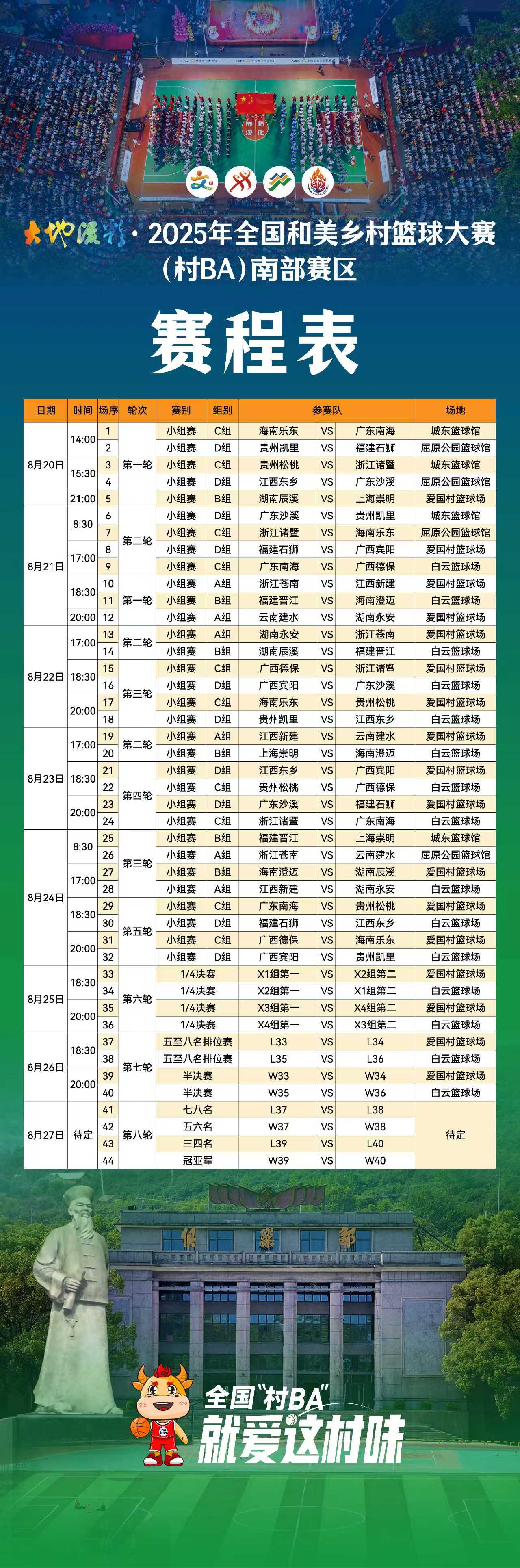 本次赛事将于8月20日—27日在湖南怀化辰溪县孝坪镇爱国村开赛,南部赛区将角逐出5个名额晋级“村BA”全国赛。除了南部赛区外,还有北部赛区和中部赛区。大区赛结束后,将于10月在贵州省台江县台盘村举办全国总决赛。