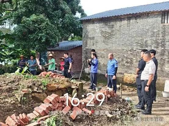 高明-高要两地联手雷霆出击,严厉打击广州新机场征地红线内违法抢建行为。8月20日下午,高明区更合镇与高要区蛟塘镇综合行政执法队开展联合巡查执法,在蛟塘镇马岭村发现一处正在施工的违法建筑。经查,该建筑未取得任何审批许可,属顶风抢建。联合执法组当场制止施工,依法开具责令整改通知书,并对当事人进行法律法规宣传教育。
