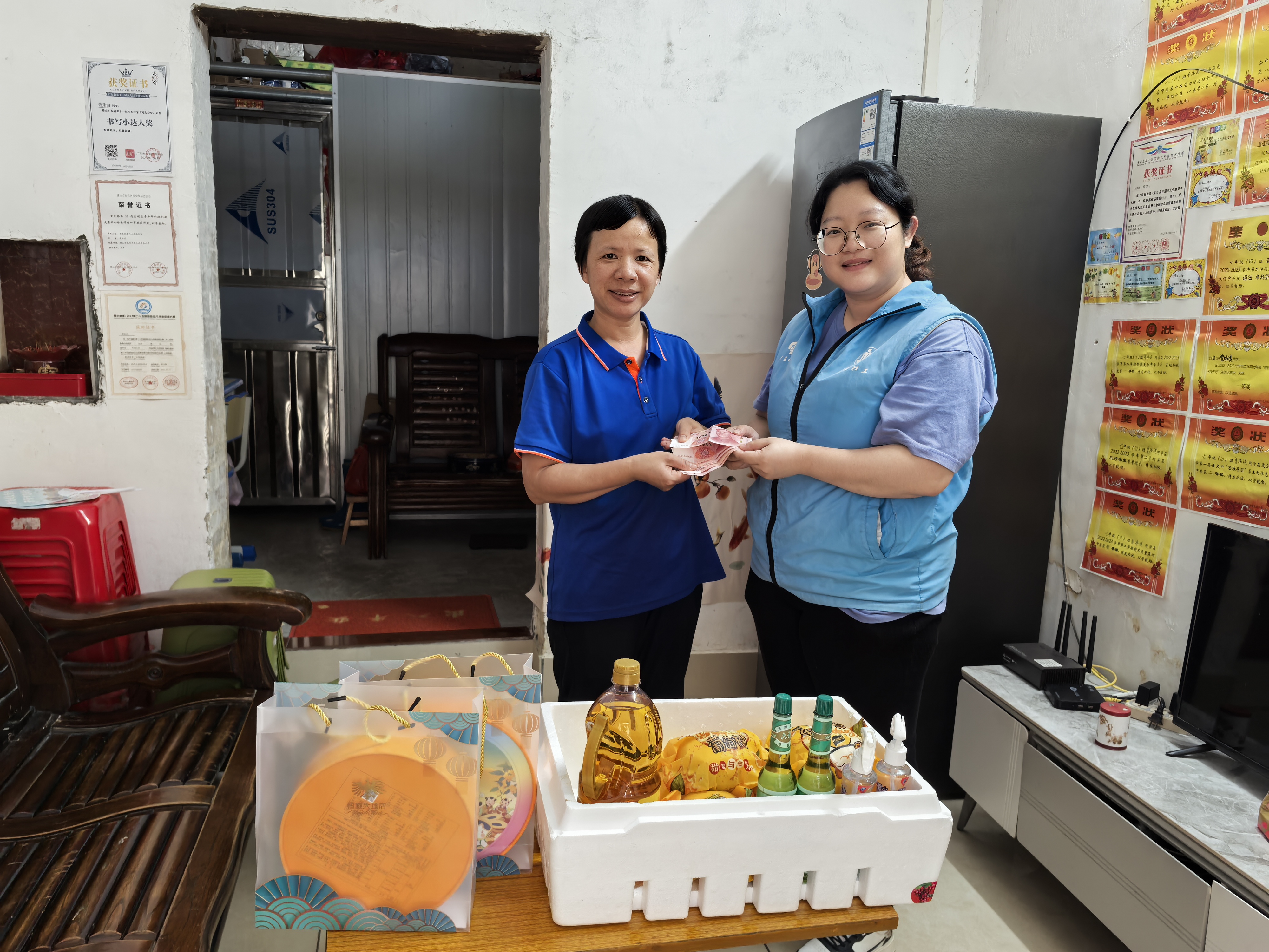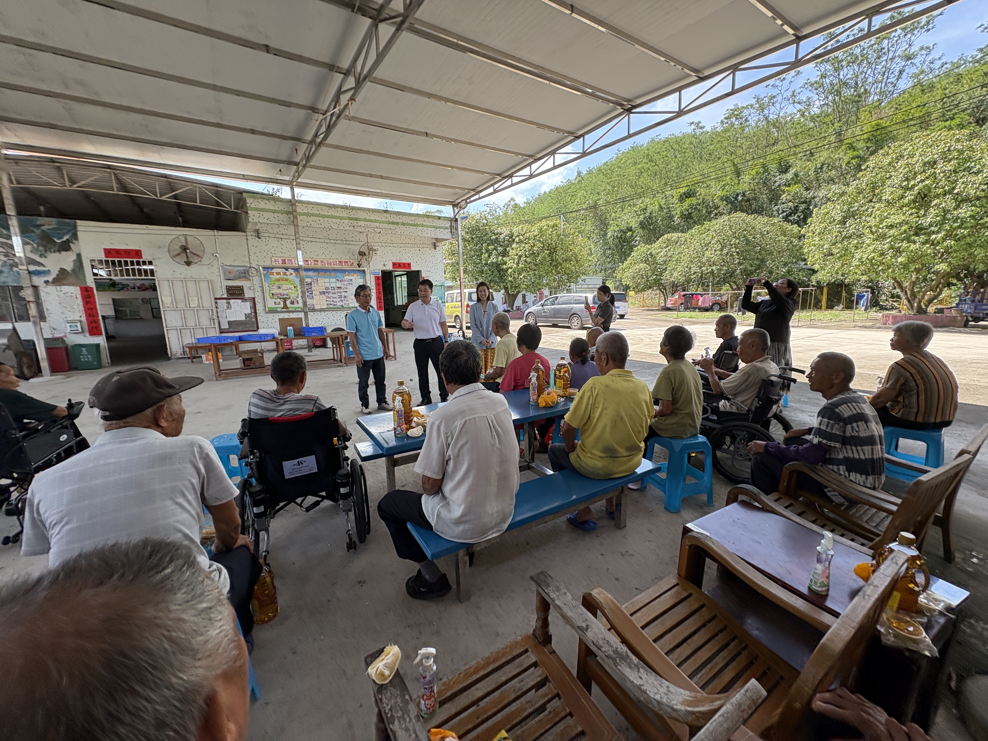 水果、月饼、花生油、蚊怕水、蚊香……慰问品件件贴心,更珍贵的是那份熟稔与亲切。“大小姐、家文哥、严老板!”村民们热情地招呼着,如同呼唤久别归家的儿女亲朋。大家围坐在一起,分享月饼和水果,聊着一年来的生活点滴,欢声笑语在小广场上空回荡。