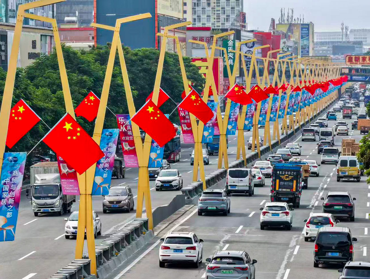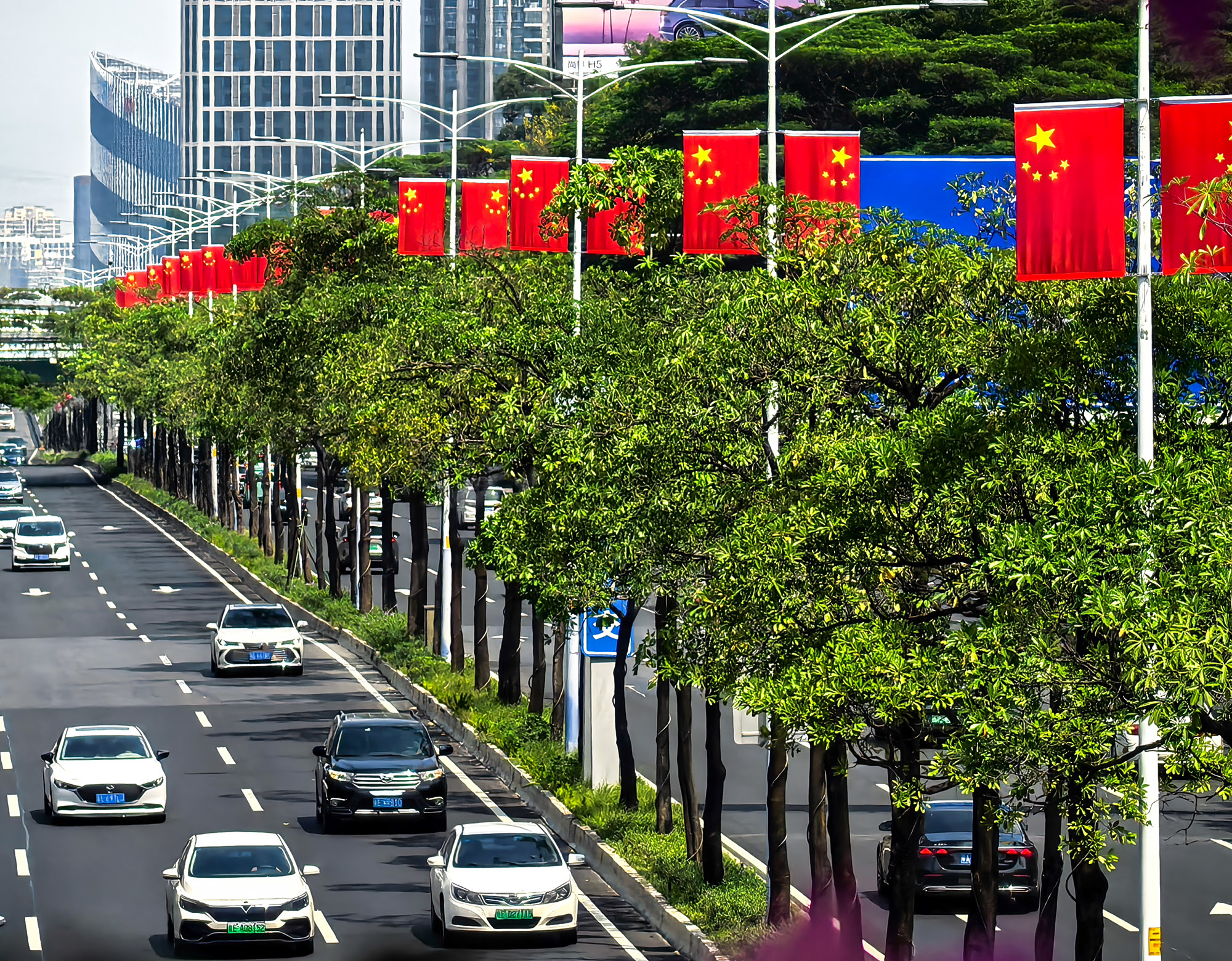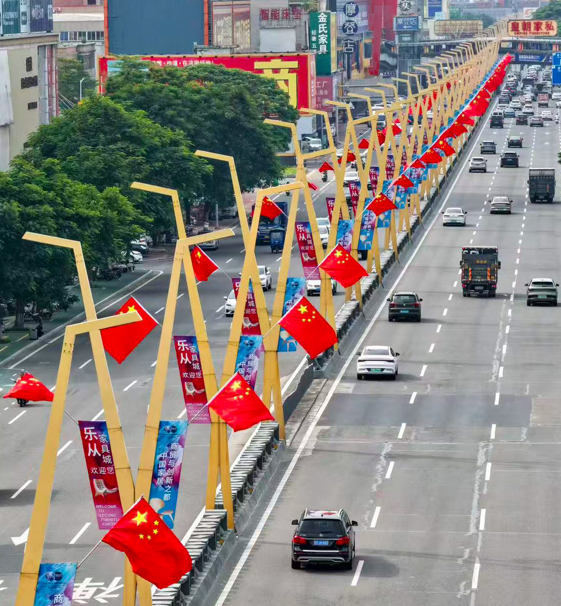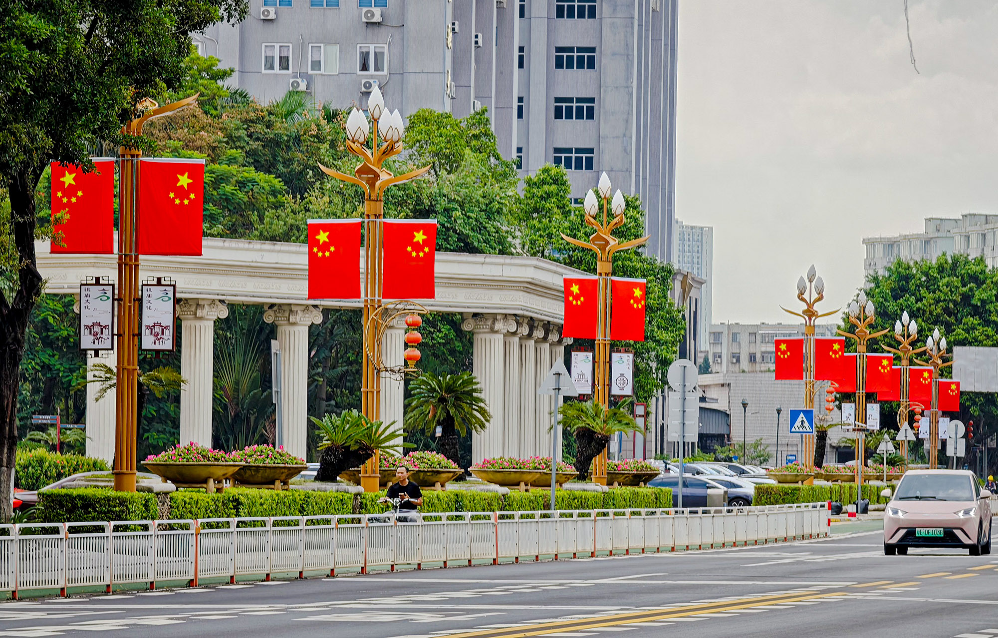 10月1日是国庆节,鲜艳的国旗飘扬全城。禅城区岭南大道、季华路等主干道,南海海八路、灯湖西路及千灯湖畔,国旗沿路灯柱整齐悬挂,营造出浓厚的氛围。