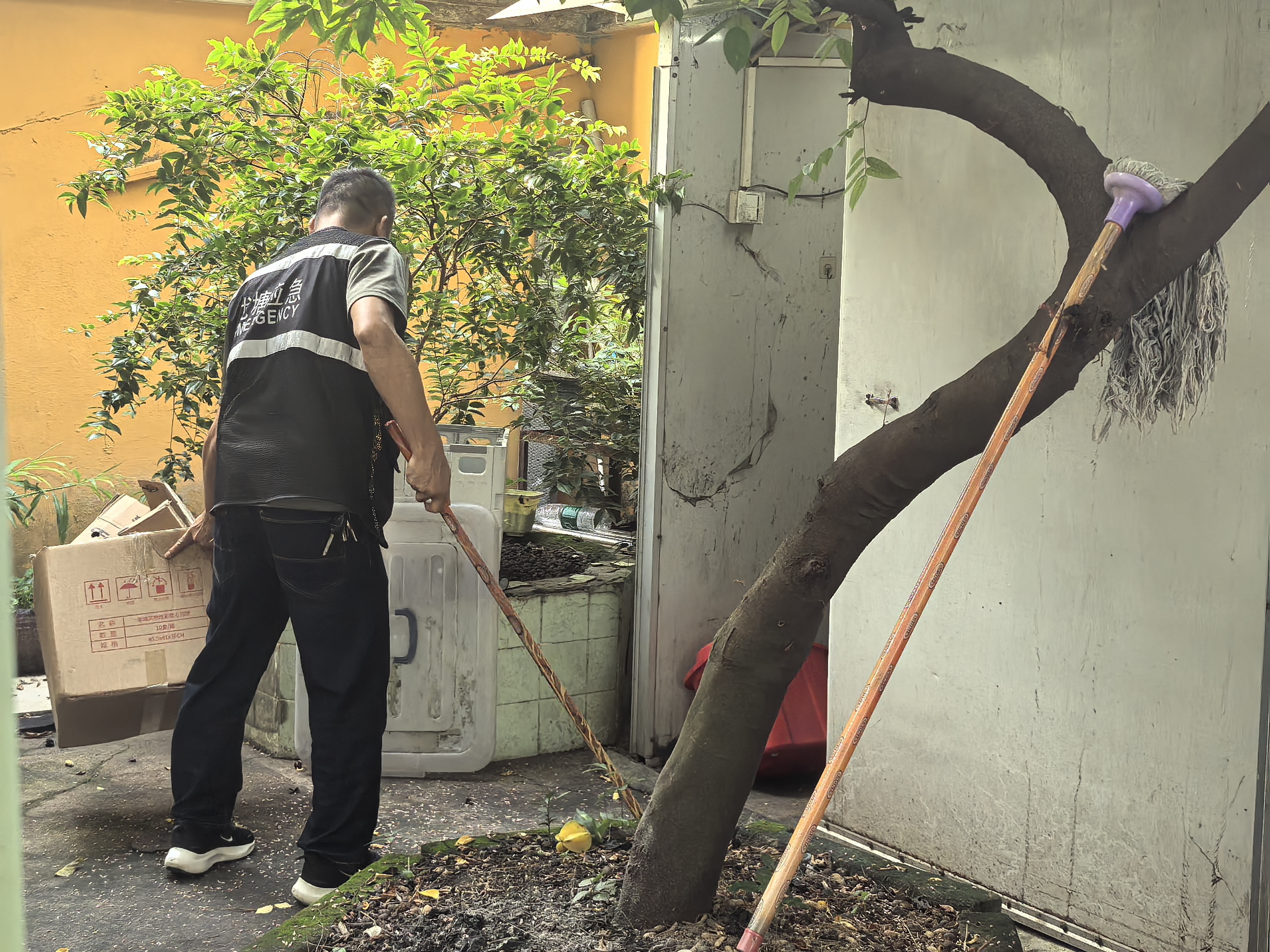 面对这一情况,值班人员邓兴良、黄醒祖临危不乱,一边安抚老板娘的情绪,一边迅速拿出长竹子、铲、钳等工具,默契配合展开捉蛇行动。他们小心翼翼地围堵、捕捉,最终成功将小蛇捕获并带离现场,消除了安全隐患。