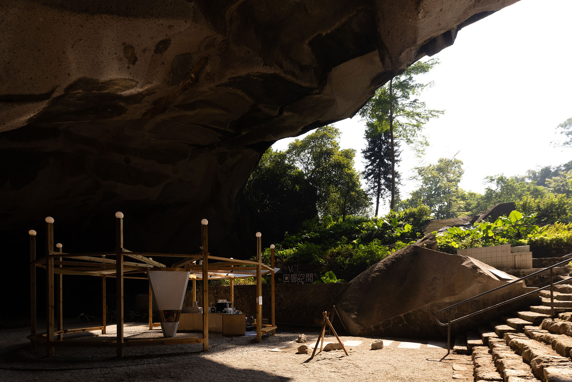 回响空间是一个坐落在西樵山石燕岩——采石遗址的配套空间。负责人阿B 介绍,石燕岩从宋代开始就有采矿痕迹,回响空间设计在岩洞的入口平台处,除了作为西樵山石燕岩的配套设施,更希望将采石文化进行年轻化的宣传。