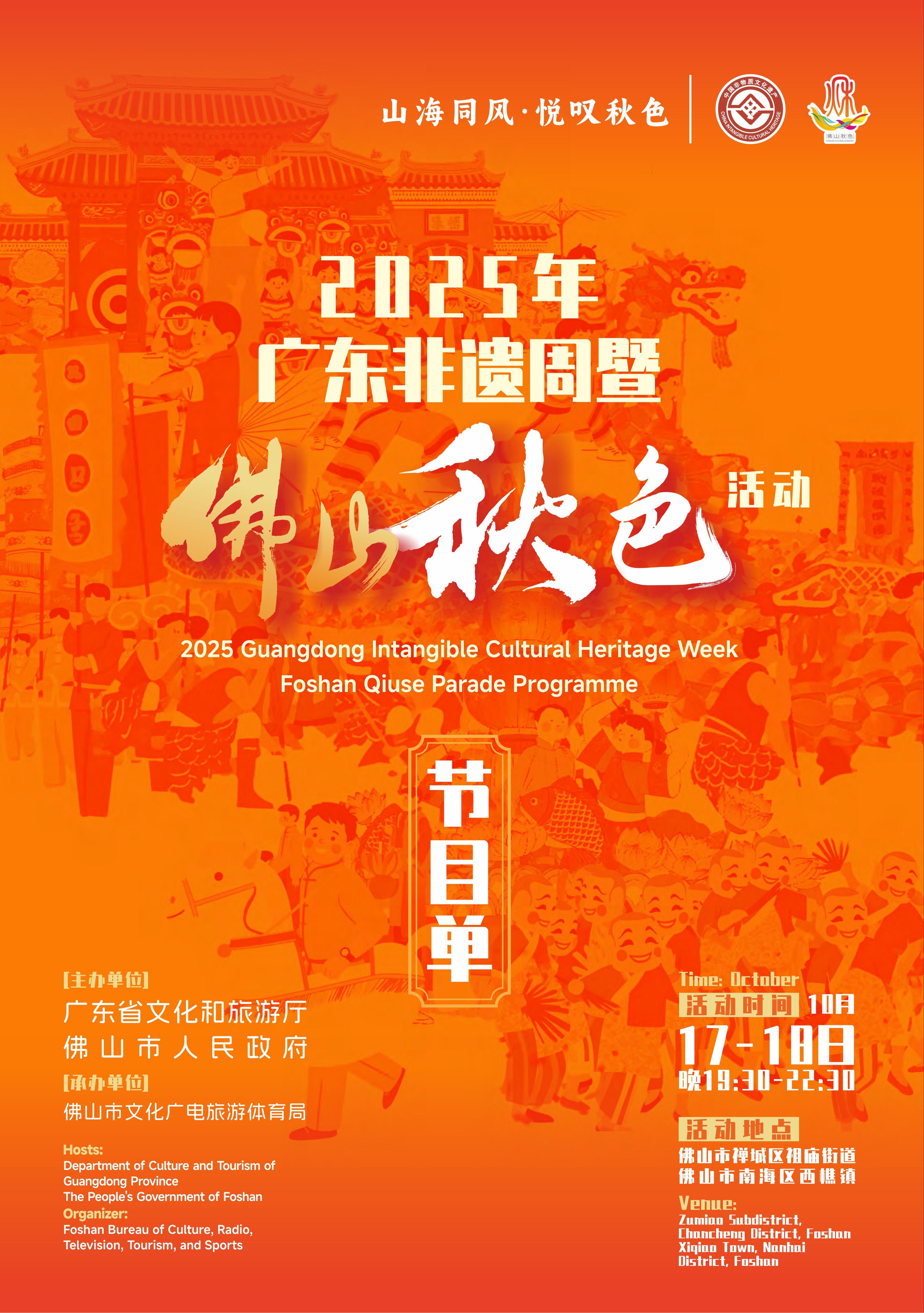 “山海同风·悦叹秋色”2025年广东非遗周暨佛山秋色活动,将于10月15日至10月19日在佛山盛大举行。作为重头戏的秋色巡游,10月17日、18日两晚,在禅城区祖庙街道及南海区西樵镇璀璨上演!