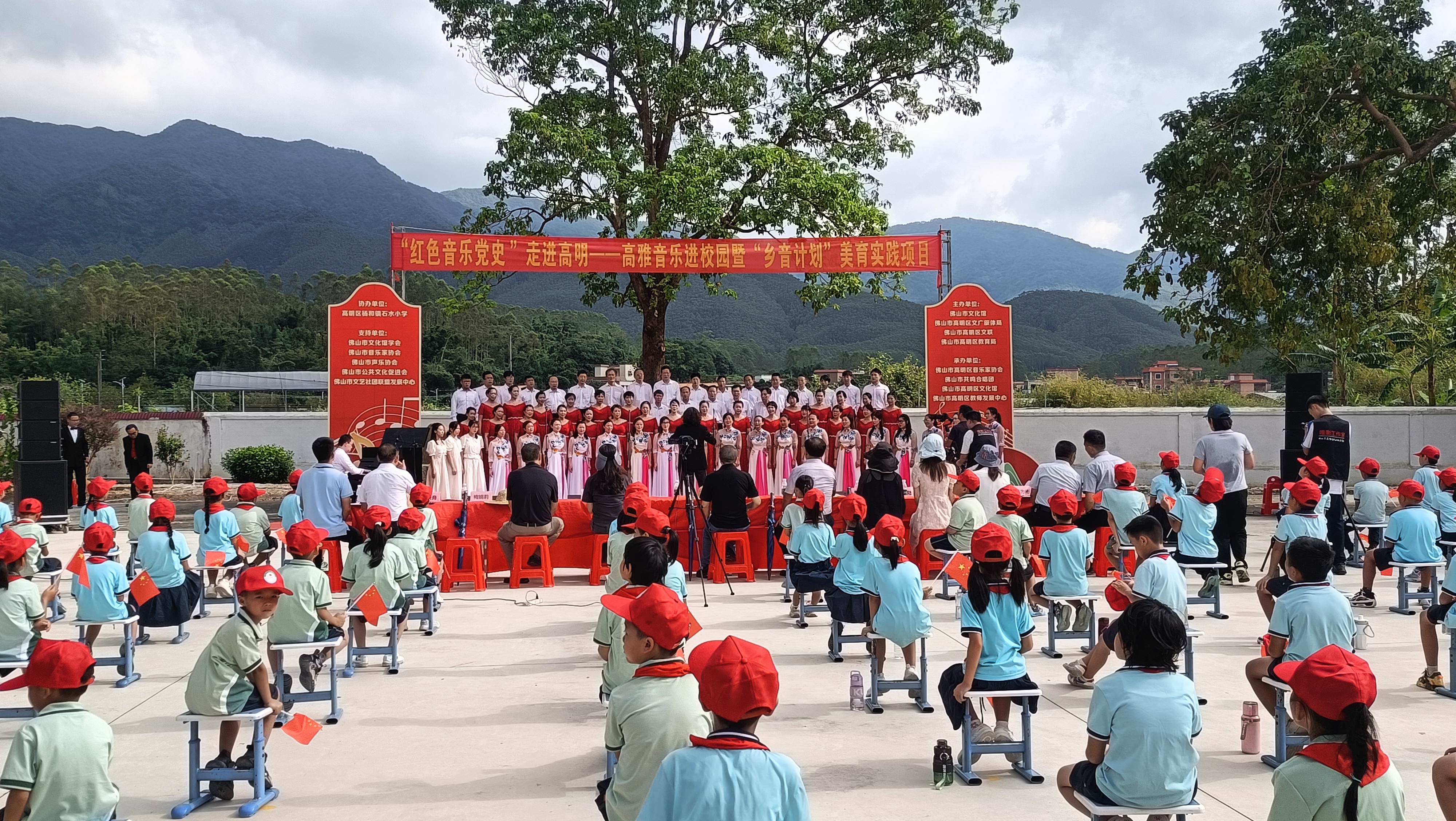 “风在吼,马在叫,黄河在咆哮!”10月14日,雄壮激昂的旋律回荡在高明区杨和镇石水小学的上空。《保卫黄河》经典乐章响起,台下数百名小学生的激情瞬间被点燃,这一刻,音乐打破了舞台的界限,将全场师生紧紧连接在一起。