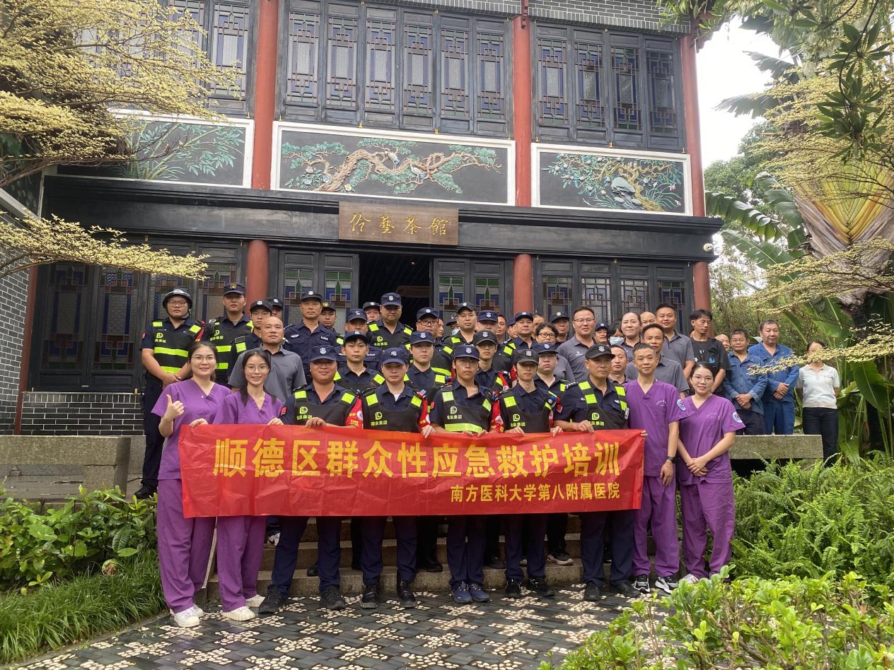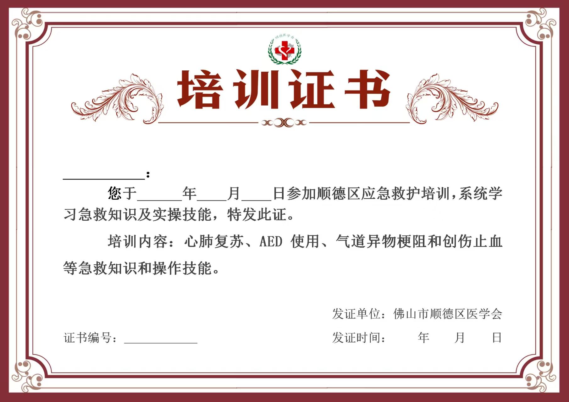 2025年,顺德区大力开展社会急救水平提升项目,致力提升公众的自救互救能力。培训面向市民免费开展,培训内容包括心肺复苏、AED使用、气道异物梗阻和创伤止血等急救知识和操作技能。培训时间约为半天,完成培训并通过考核者可获得由顺德区医学会统一颁发的电子版培训证书。