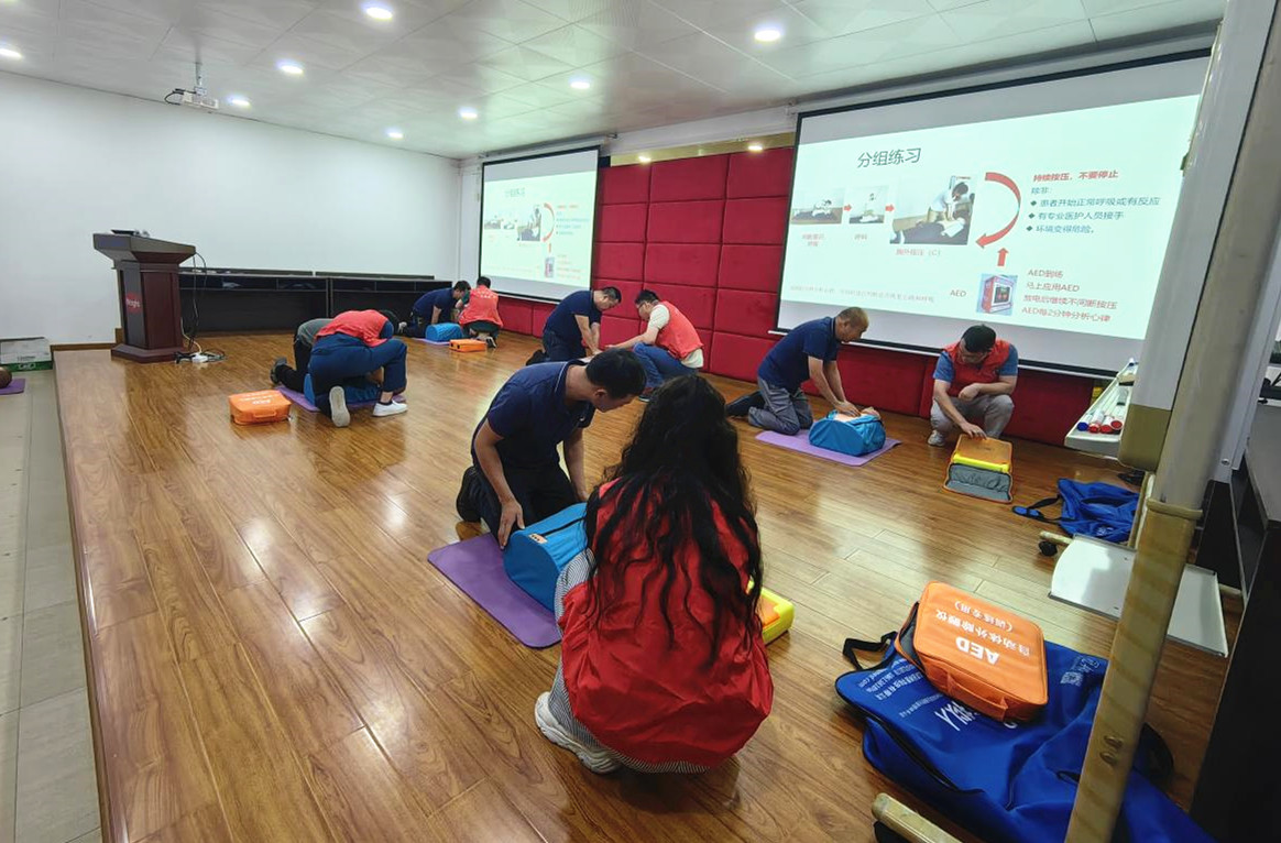 大良街道某企业应急救护培训现场,学员分组实操练习。