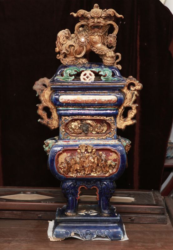这件香炉的收藏者——中山藏家何湛泉介绍,此炉高逾一米,为清代文如璧真品,造型古朴大气,通体施釉肥厚莹润,以蓝釉为基底,层次分明的造型中融合了陶塑、金箔贴饰与潮州木雕雕刻等多重技法,完美诠释了石湾窑“仿钧而不泥钧”的独特风格。