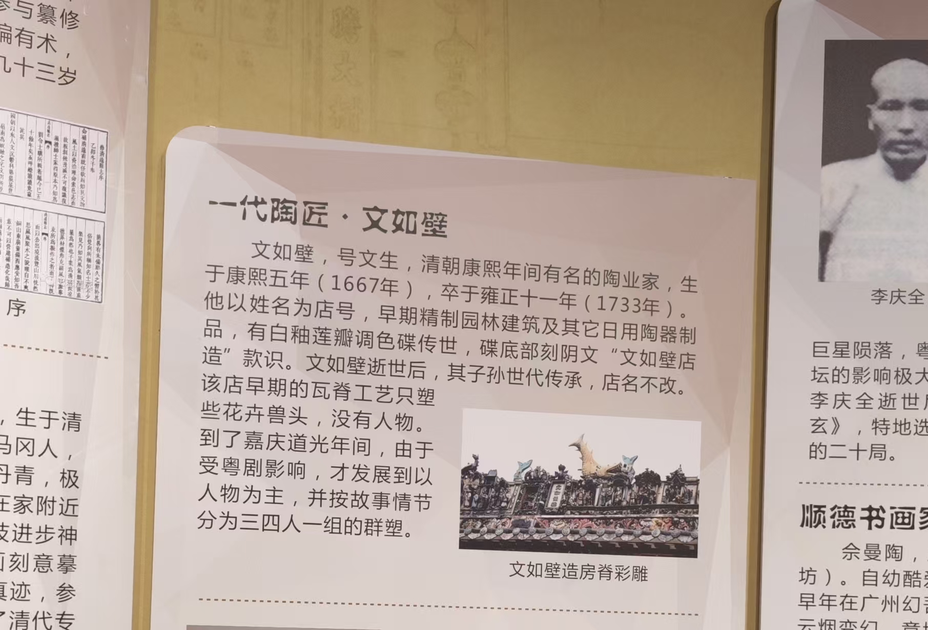 文如璧,顺德容桂马冈村人,清代石湾陶艺史上举足轻重的杰出匠人。他以“窑火为魂、陶土为骨”,其开创的“文如璧”店号,既是石湾瓦脊陶塑的代名词,更让石湾窑凭借“甲天下”的美誉,成为岭南文化的璀璨名片。