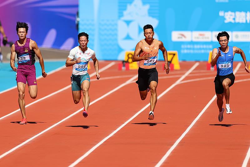 △男子100米预赛,杨俊、邓信锐、谢震业、李孟源(从左至右)。短跑老将谢震业将亮相男子百米“飞人大战”决赛,而新生代猛将邓信锐、李泽洋、何锦櫶同样实力强劲,期待他们在赛场上的表现。