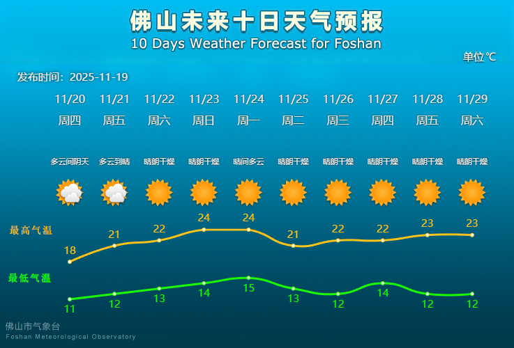 佛山市气象台11月19日预报,20日多云间阴天,气温小幅回升至11℃~18℃,全天气温保持“1”字头,体感寒凉。21日多云到晴,气温12℃~21℃;22日至23日(周末)晴朗干燥,气温分别逐日升至13℃~22℃、14℃~24℃;24日晴间多云,气温15℃~24℃。展望25日起冷空气活动频繁,气温略有下降,天气持续晴朗干燥。