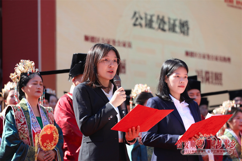 主办方负责人表示,参加顺德职工集体婚礼的职工新人们来自五湖四海、各行各业,因为奋斗相聚顺德,又因为爱情扎根顺德。职工新人们既是顺德高质量发展的建设者,也是顺德城市温度的亲历者。
