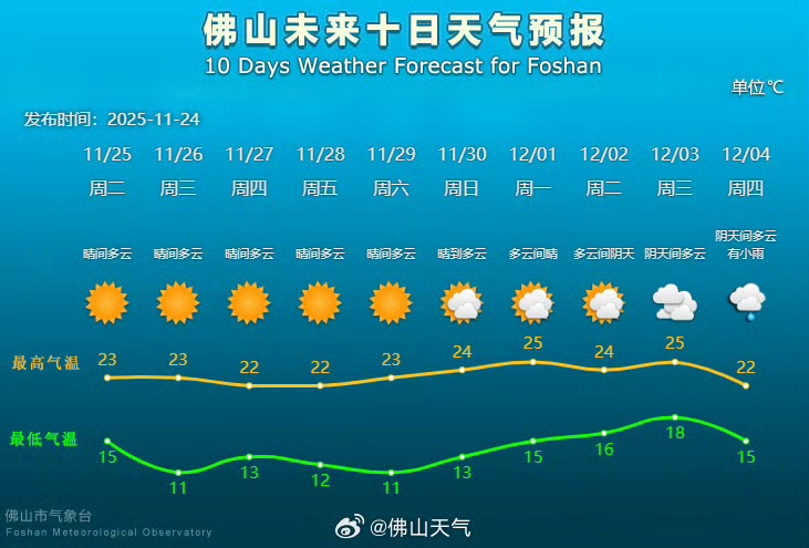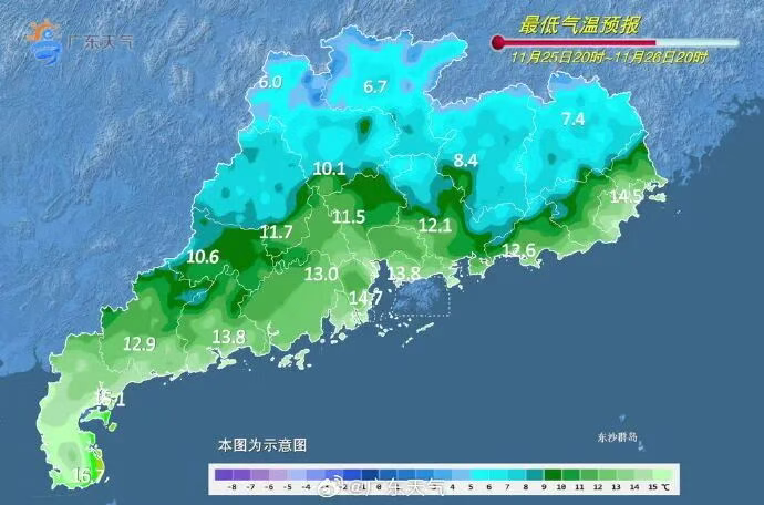 25日(周二),南部沿海市县多云转晴,其余市县晴到少云。最低气温:粤北偏北市县9~12℃,南部沿海市区16~19℃,其余市县12~15℃。