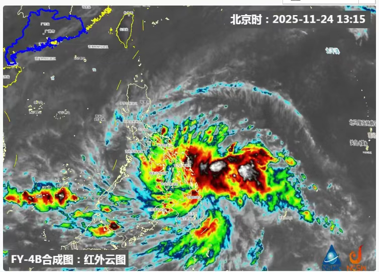 11月24日17时,热带低压中心位于菲律宾马棉兰老岛东北部近海海面上,也就是北纬9.6度、东经126.0度,中心附近最大风力7级(15米/秒),中心最低气压1004百帕。