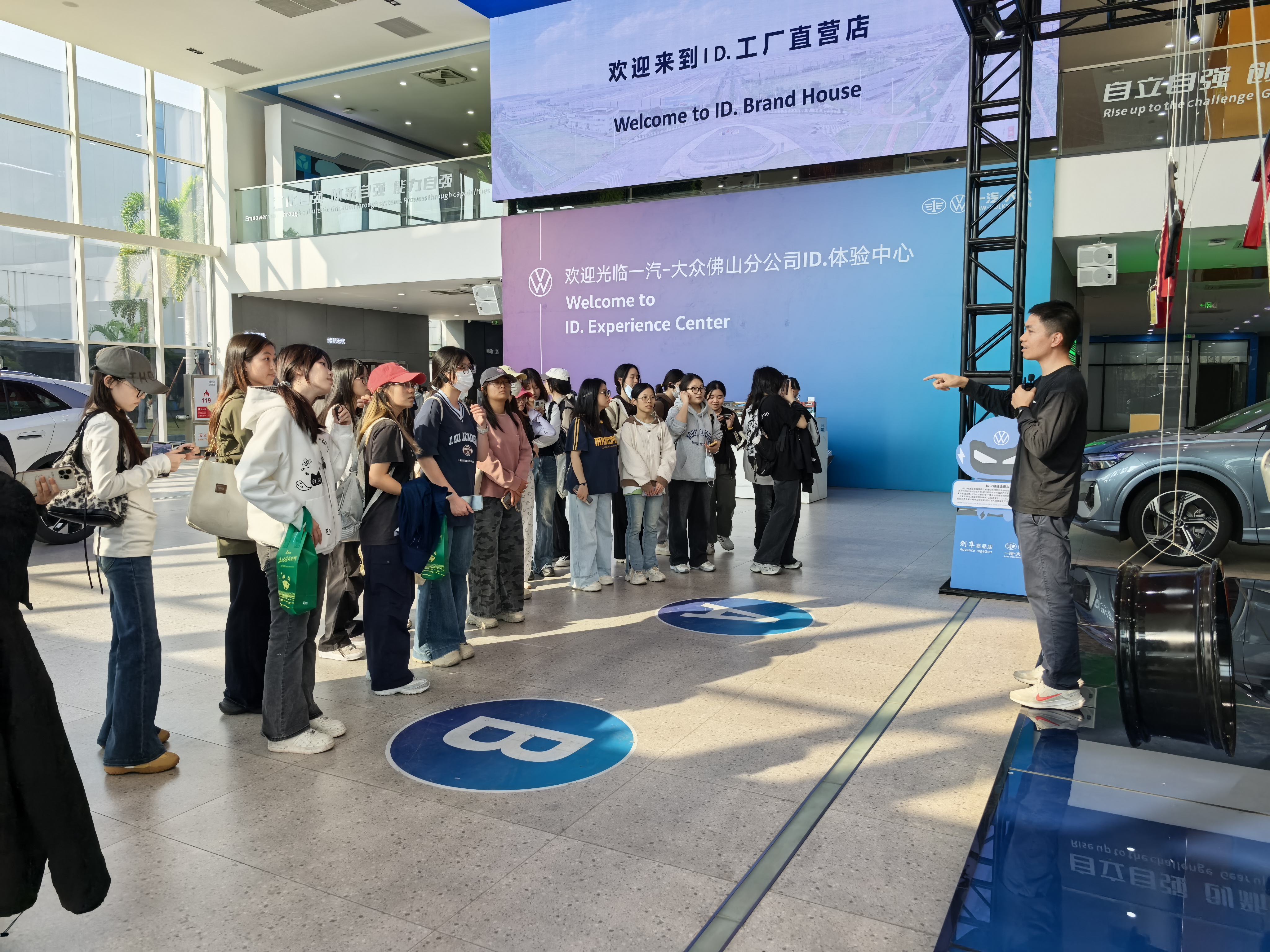 作为德国大众集团全球最先进的工厂之一,一汽-大众华南基地年产能达60万辆,生产大众品牌高尔夫G8、探歌、ID(4、6、7)新能源系列以及奥迪品牌Q2、奥迪Q4等多款热门车型。在焊装车间里,同学们见证超2000台机器人协同作业,1分钟内即可流水线生产一台车身,机器人与工人默契配合,完成底盘安装、零部件装配等流程。车辆从无到有,仿佛被赋予了生命,让人感叹现代制造业的神奇。通过虚拟现实(VR)和增强现实(AR)技术,他们沉浸式感受汽车从设计、生产到交付的全过程,直观了解智能制造的奥秘。在汽车历史文化展馆,从一汽-大众的发展历程到德系汽车的精密工艺,再到佛山醒狮文化的融入,让人感受到科技与文化的深度共鸣。