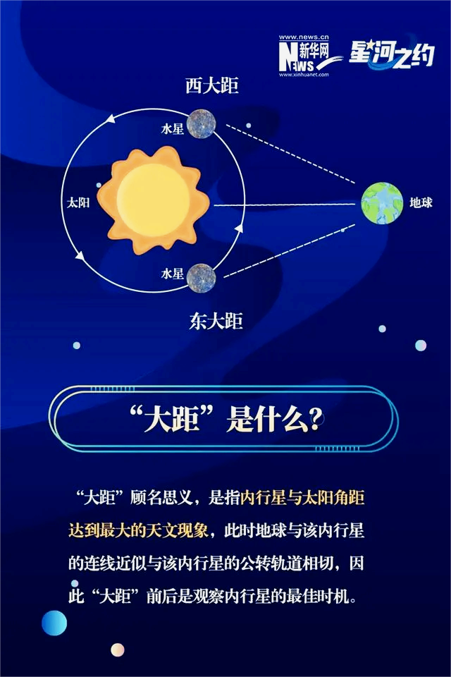 作为太阳系最内侧的行星,水星因距离太阳最近,位置更靠近地平线,轻易被阳光淹没,平时难得一见。水星每88天绕太阳运行一圈,而地球也在不停公转,大约每116天水星就会在地球与太阳之间“穿行”一次。当水星运行到其公转轨道距离太阳最西或最东端(即西大距或东大距),才能摆脱阳光的干扰,在清晨或傍晚成为天空中的“显眼包”。