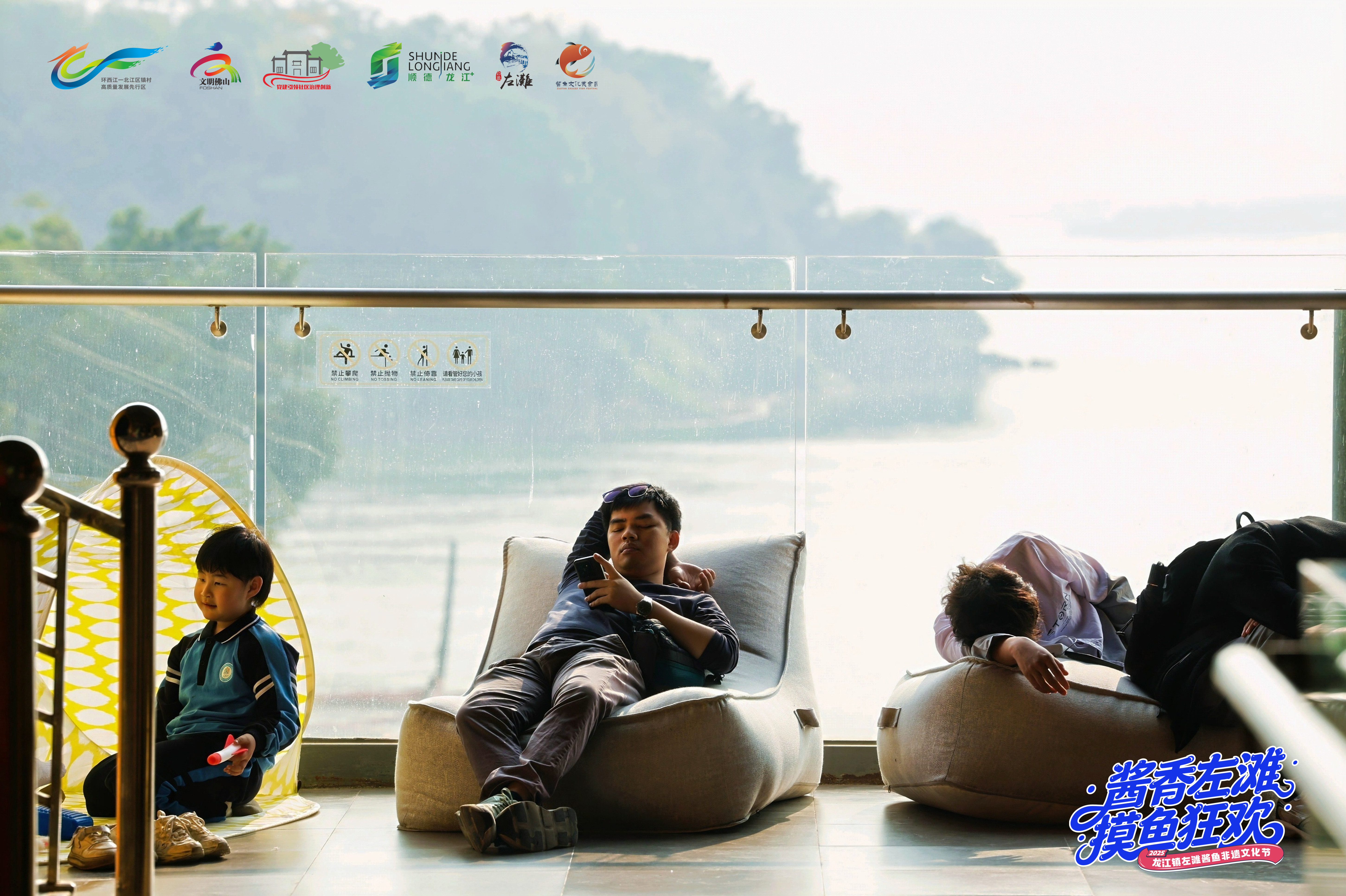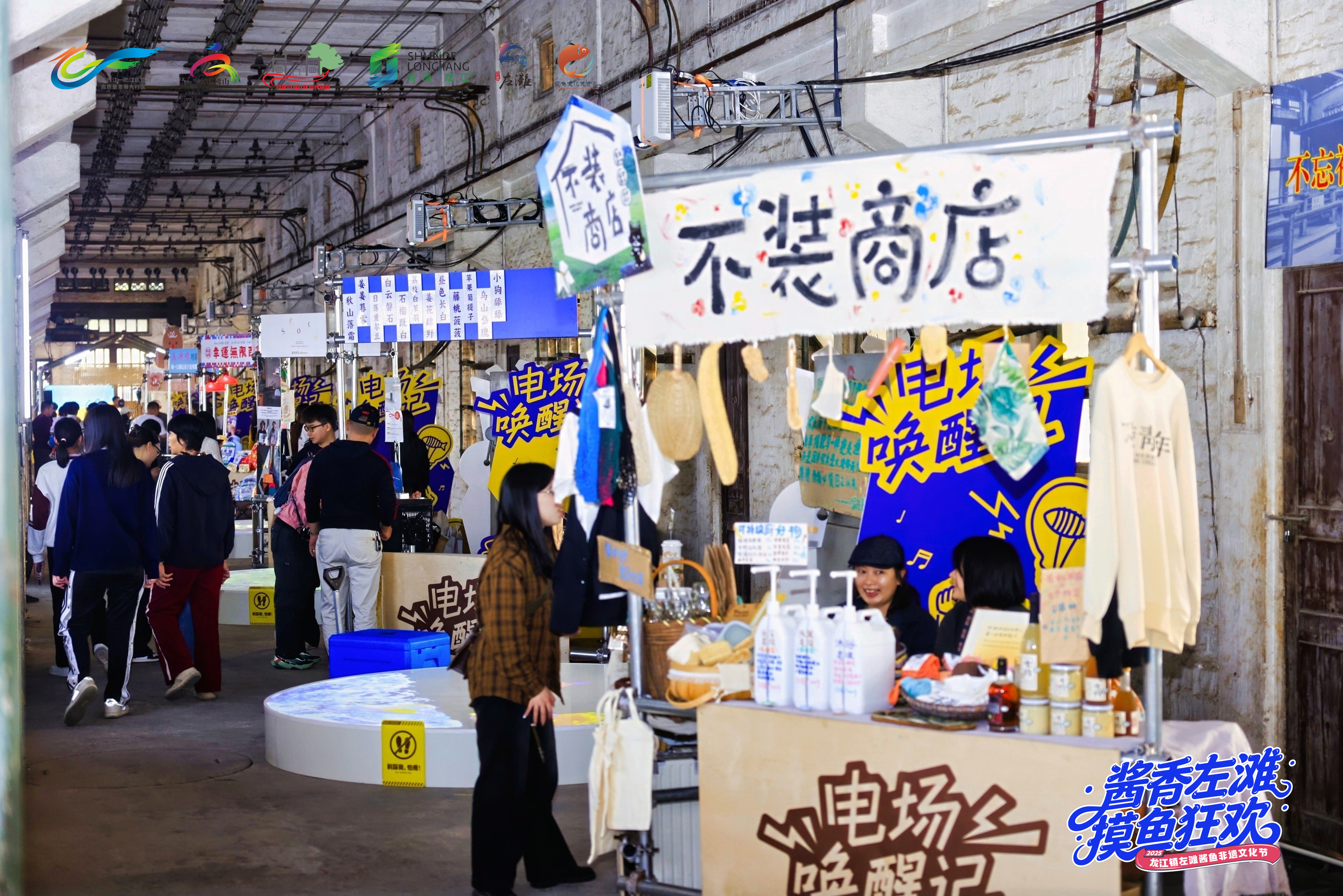 与此同时,以光影、展览、市集、论坛、游戏为媒介,一场关于“放电”与“摸鱼”的在地文化创意实验,在甘竹滩发电站上演。“停止工作,快来摸鱼”“摸鱼我是专业的”等有趣标语点缀在不同角落,让整个场域都展露出轻松、放松的状态。