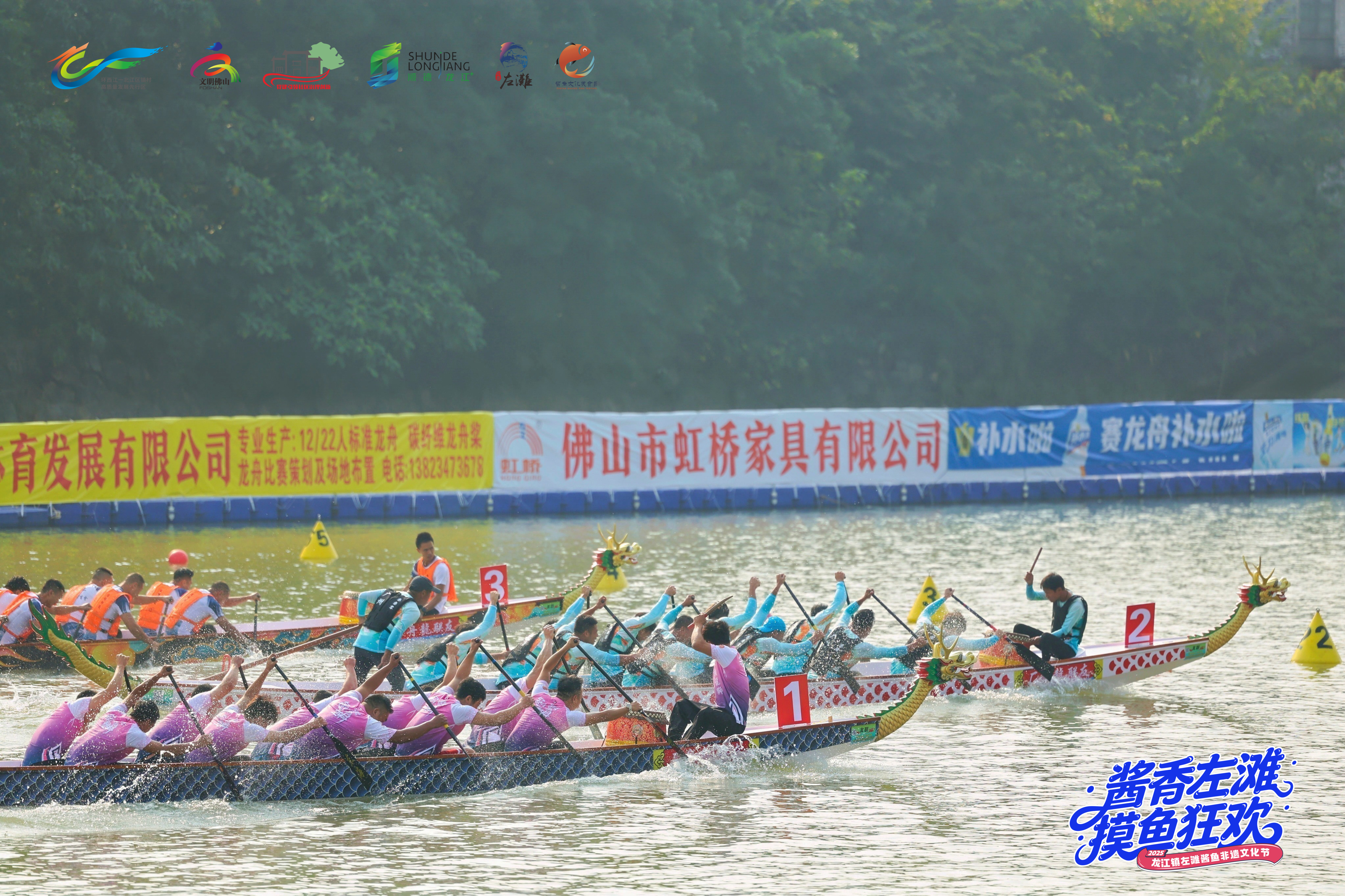 当天,陈涌石堑舞龙、醒狮、鱼灯等非遗展示,酱鱼节吉祥物“酱君”“鱼宝”以及“大湾鸡”惊喜快闪,率先掀起了一波热潮。不远处,甘竹溪上,来自省内外的75支龙舟队伍,上演着一场场水上竞速,引来市民游客的围观、欢呼。