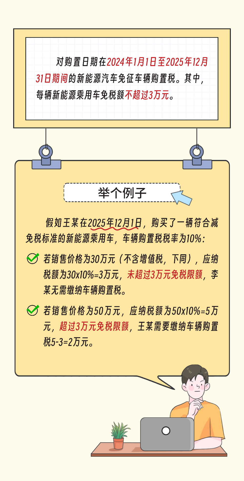 一、对购置日期在2024年1月1日至2025年12月31日期间的新能源汽车免征车辆购置税,其中,每辆新能源乘用车免税额不超过3万元;对购置日期在2026年1月1日至2027年12月31日期间的新能源汽车减半征收车辆购置税,其中,每辆新能源乘用车减税额不超过1.5万元。