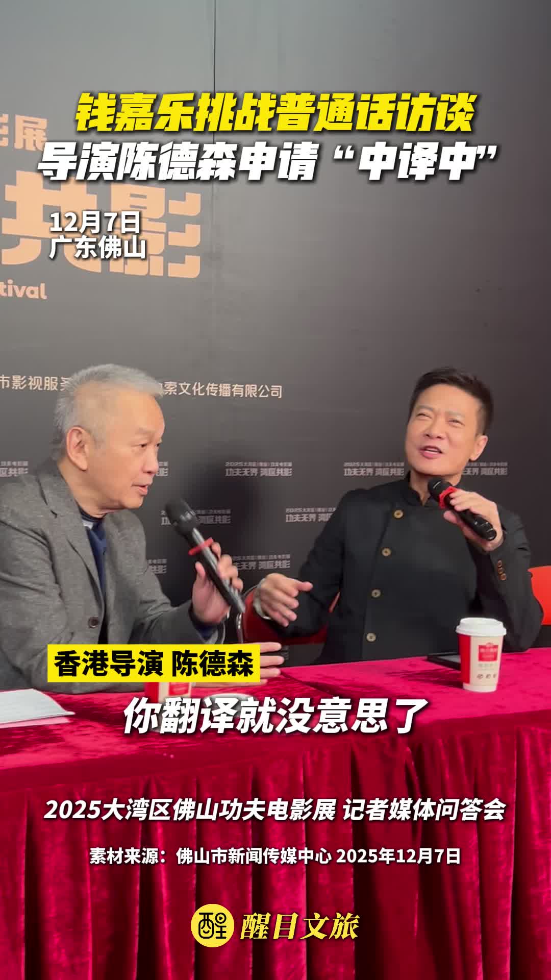 12月7日晚,在大湾区佛山功夫电影展记者媒体问答会上,艺人钱嘉乐用粤语、普通话回答记者提问。“粤普”引得一旁的导演陈德森直言:“我帮你翻译翻译。”(记者:黎晓彤;制作:胡煜;责编:梁铭鼎)#佛山 #有功夫来佛山 #2025大湾区佛山功夫电影展 # 钱嘉乐 #陈德森