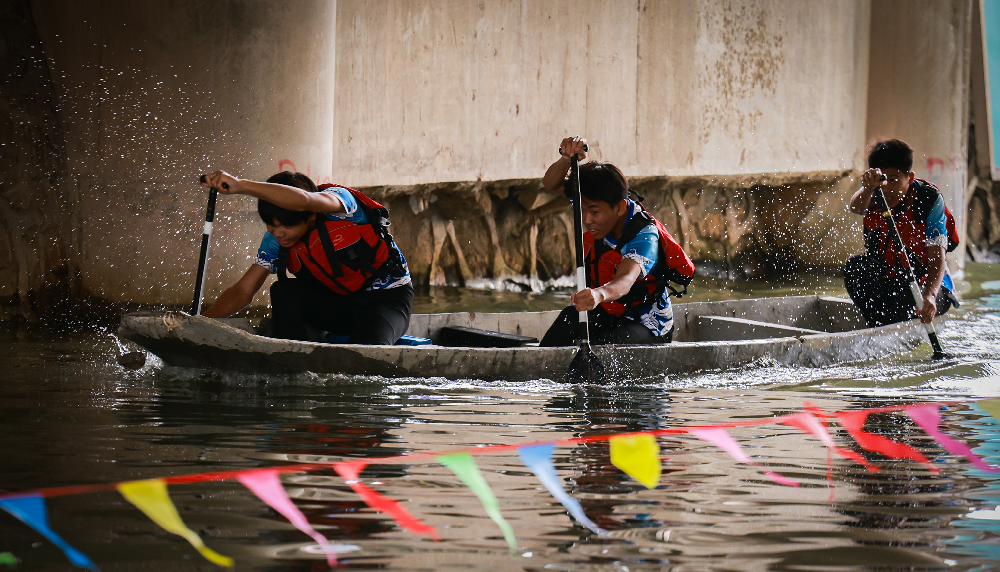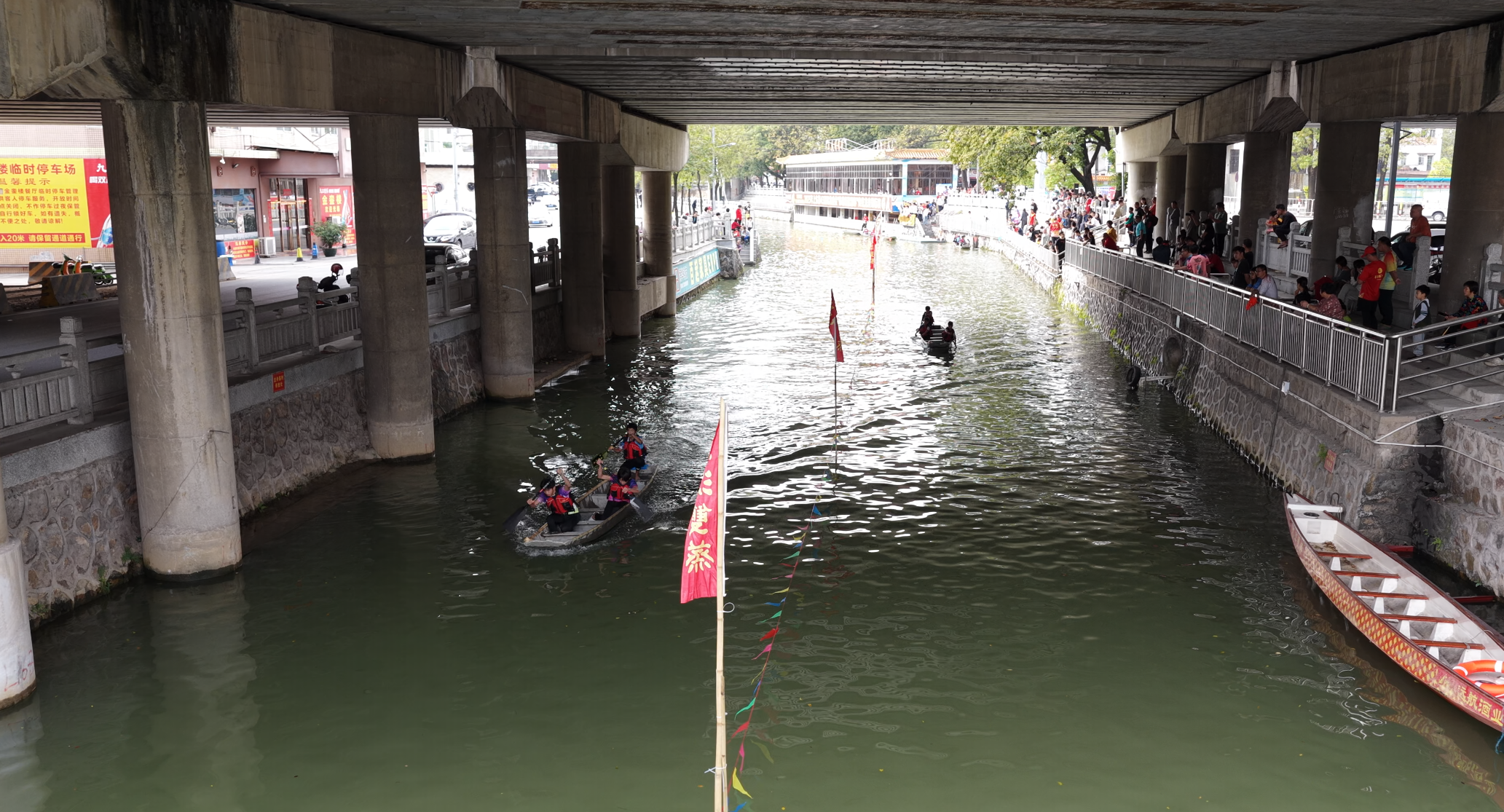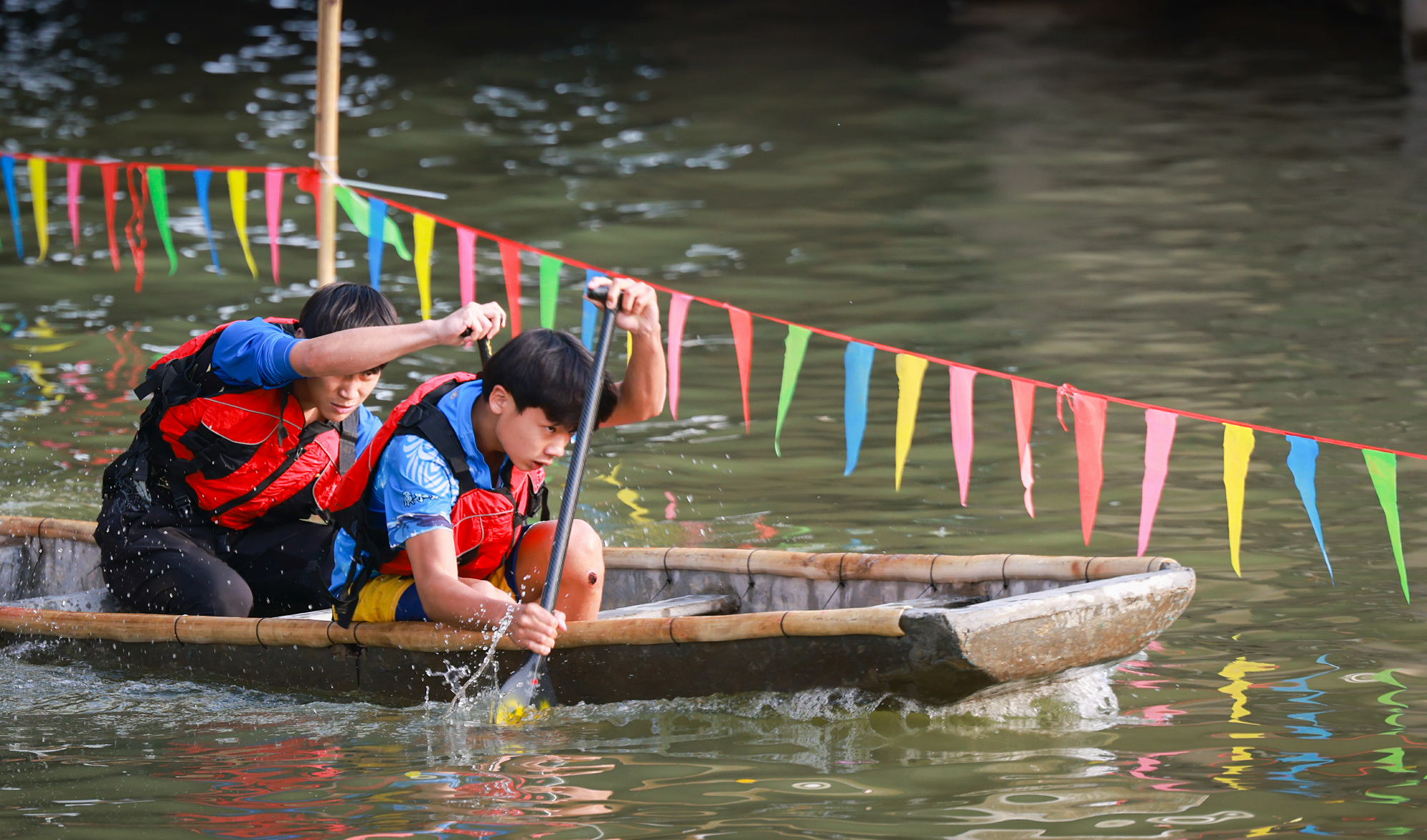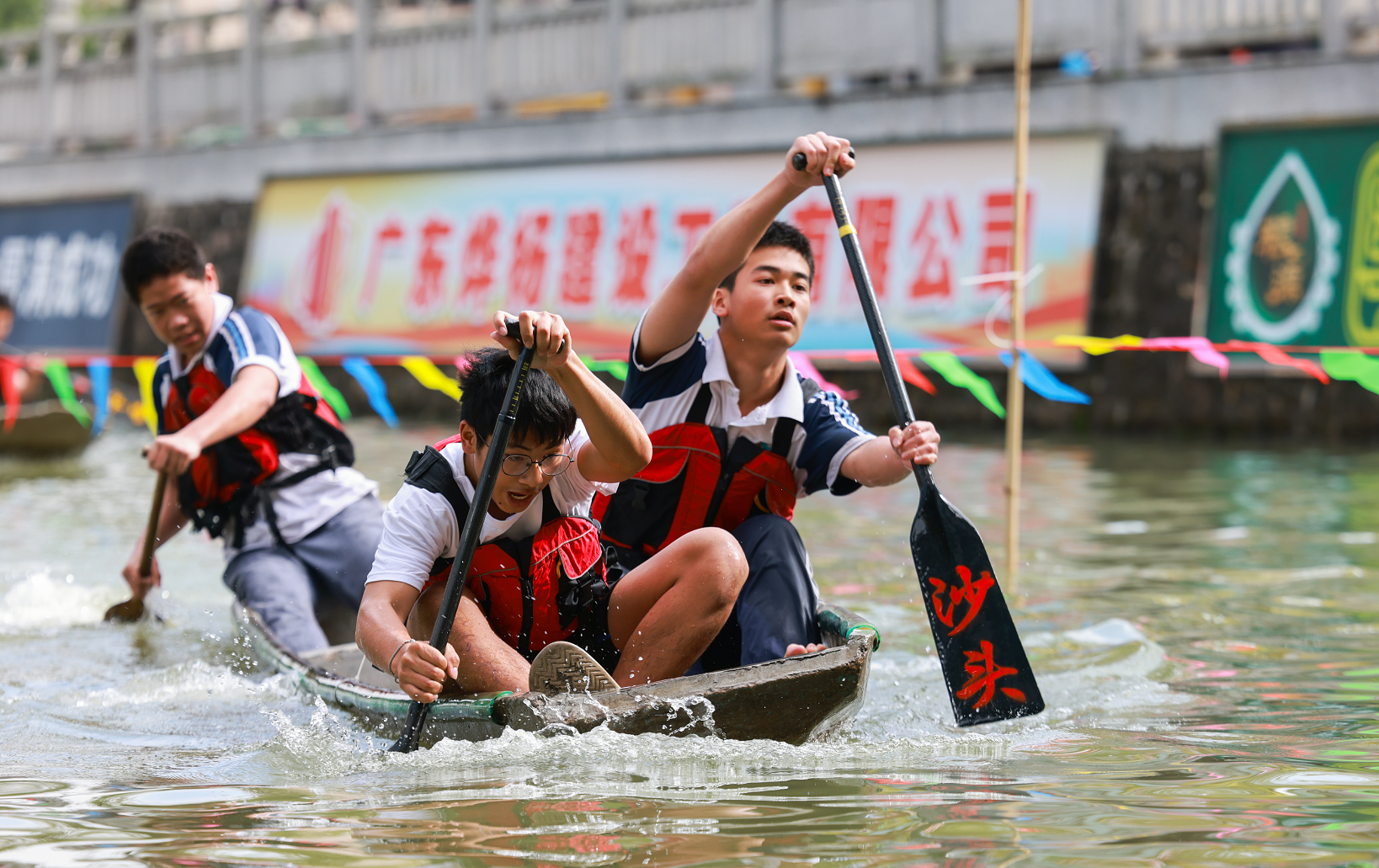 鼓声擂动,桨影翻飞,南海区九江镇上东社区的河涌上人声鼎沸,第二届“上东街坊会杯”青少年3人草艇赛在这里火热举行。水乡少年们喊着整齐号子,划着草艇劈波前行,岸边观众的呐喊助威声此起彼伏,沸腾了整个河畔。