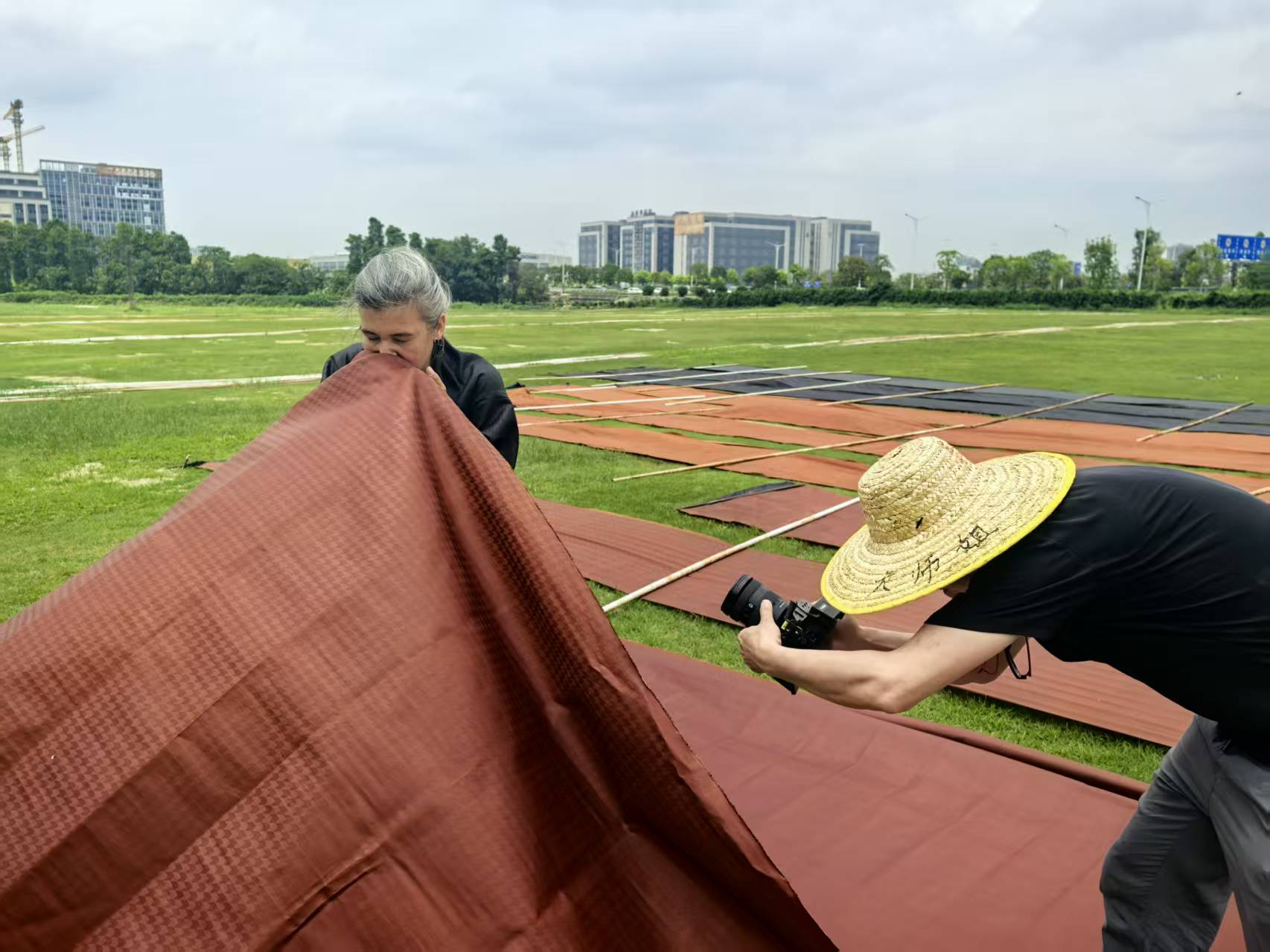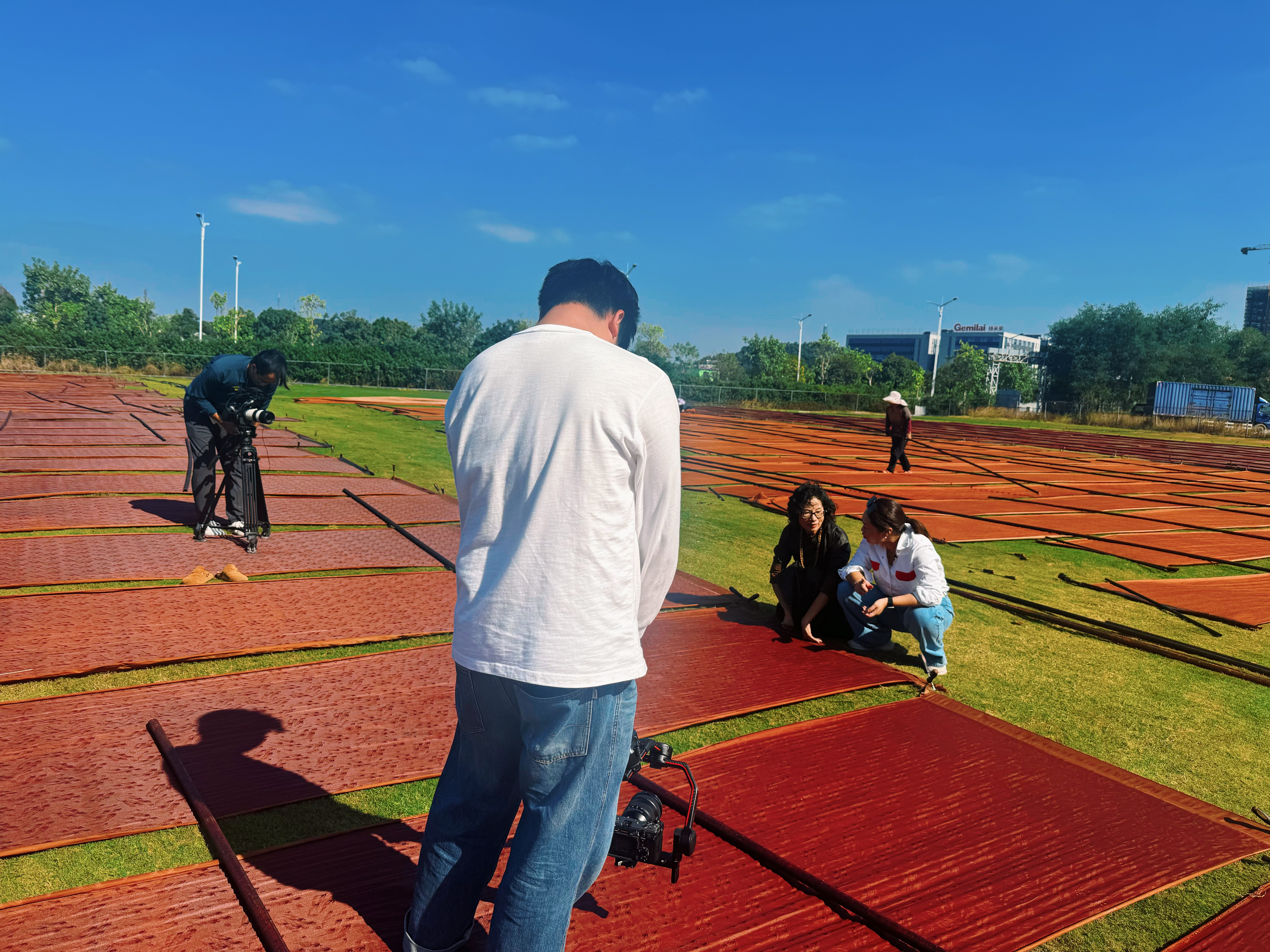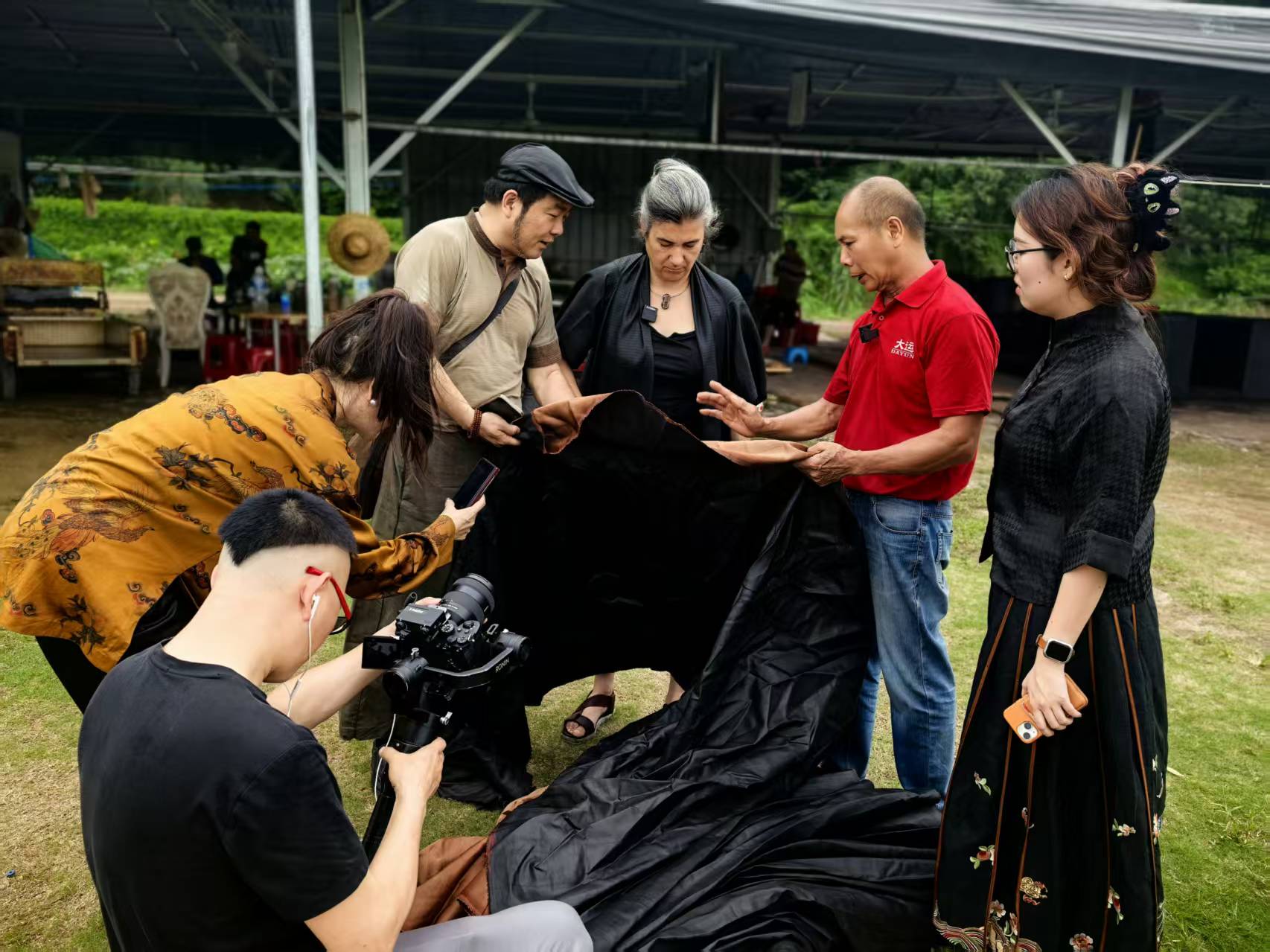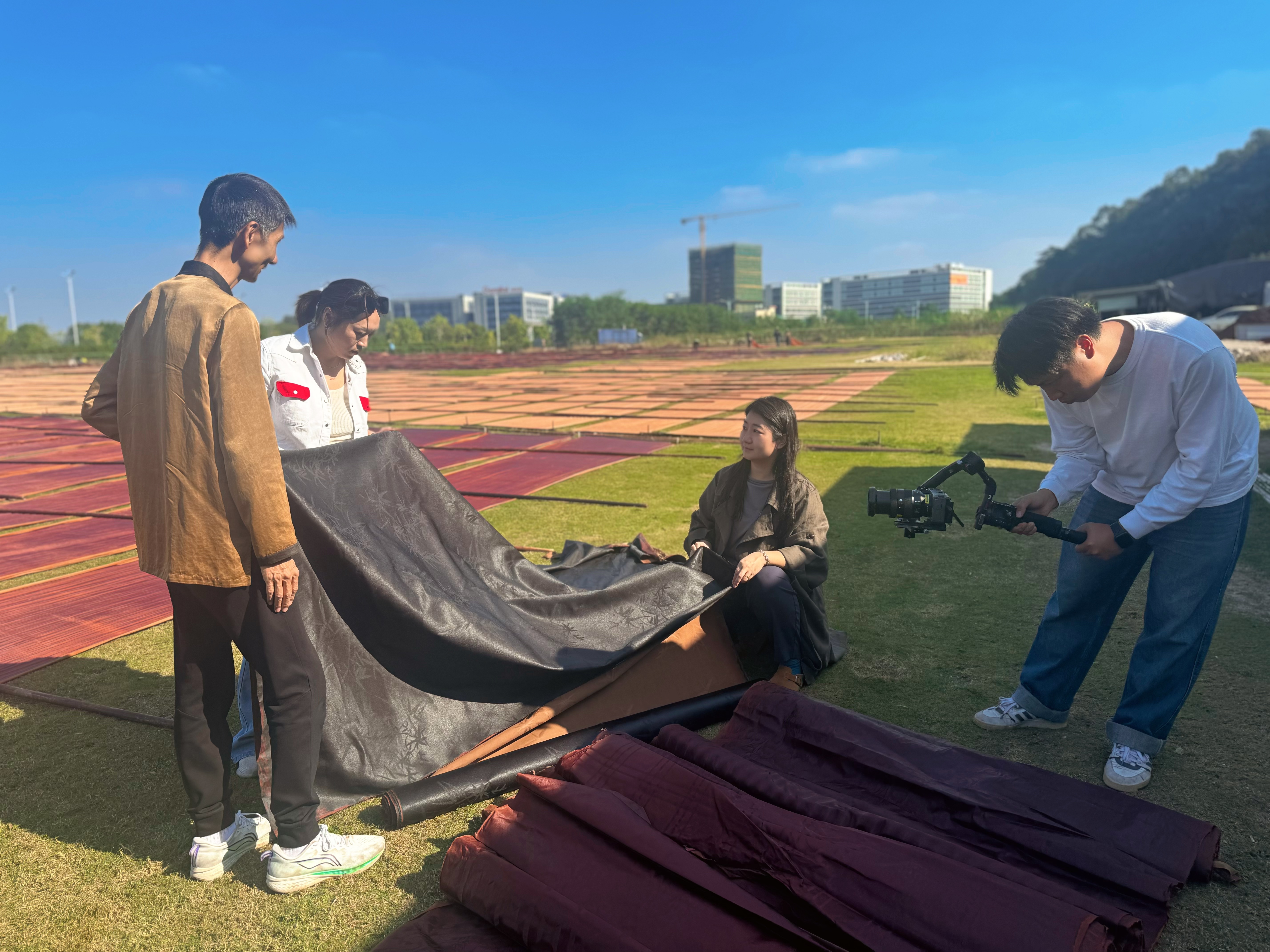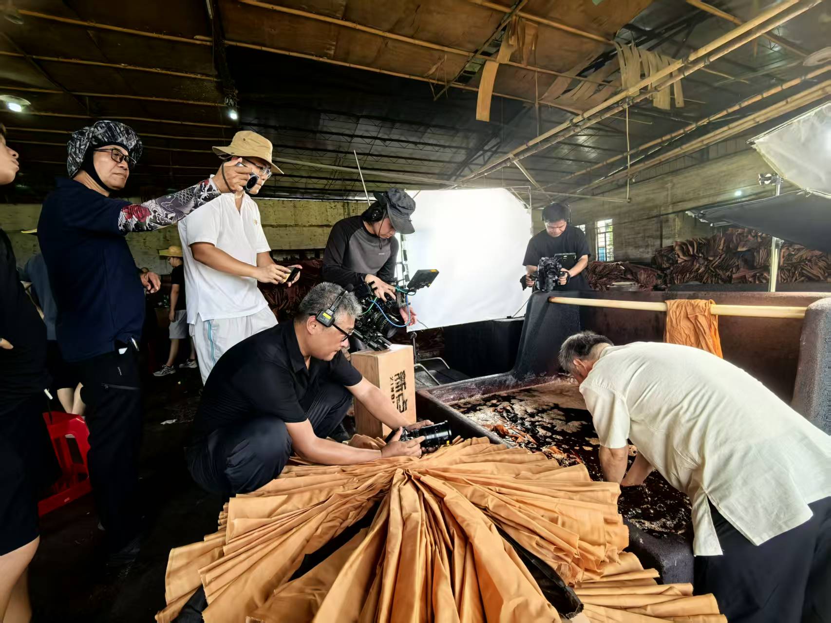 在顺德伦教晒场,摄制团队连续守候多日,捕捉从晨光到夕阳下阳光与布匹的每一次光影交融。香云纱晒制对天气极为苛刻,晴雨不定的日子里,他们既记录工艺的细腻流程,也定格匠人与天气赛跑的执着,让“天人合一”的东方智慧有了生动注脚。