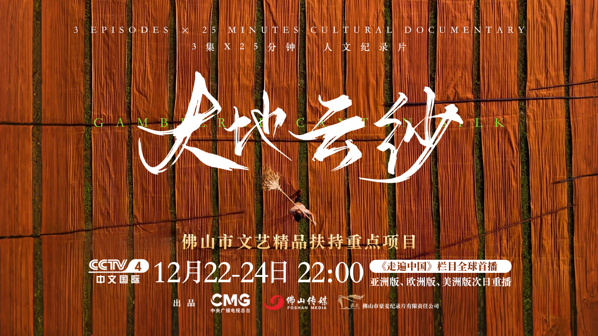 恰逢佛山传媒文旅集团揭牌启航,大型系列纪录片《大地云纱》于12月22日至24日每晚10时,在央视中文国际频道(CCTV-4)《走遍中国》栏目连续三晚首播,并通过央媒海外多频道多语种同步全球传播。