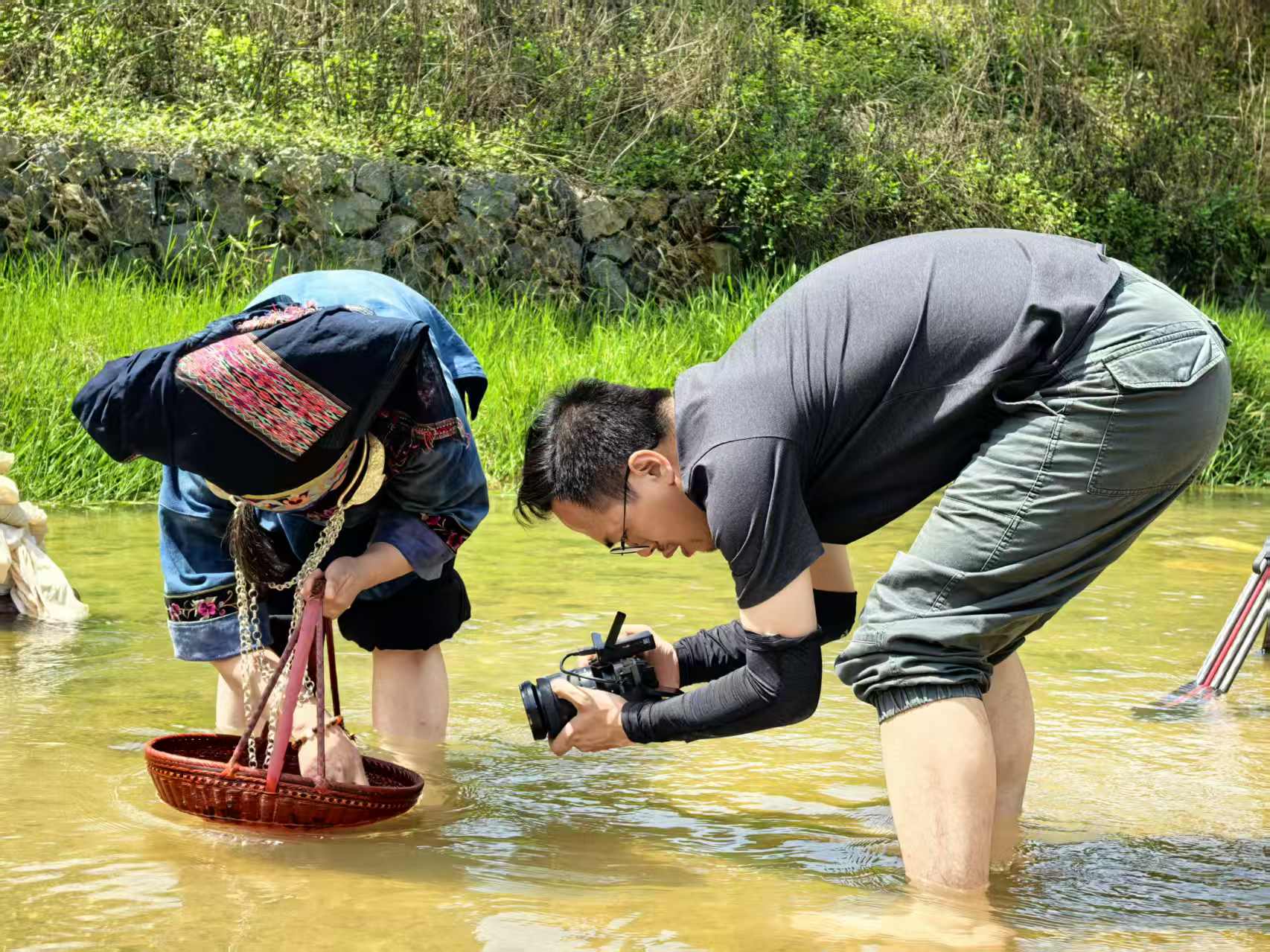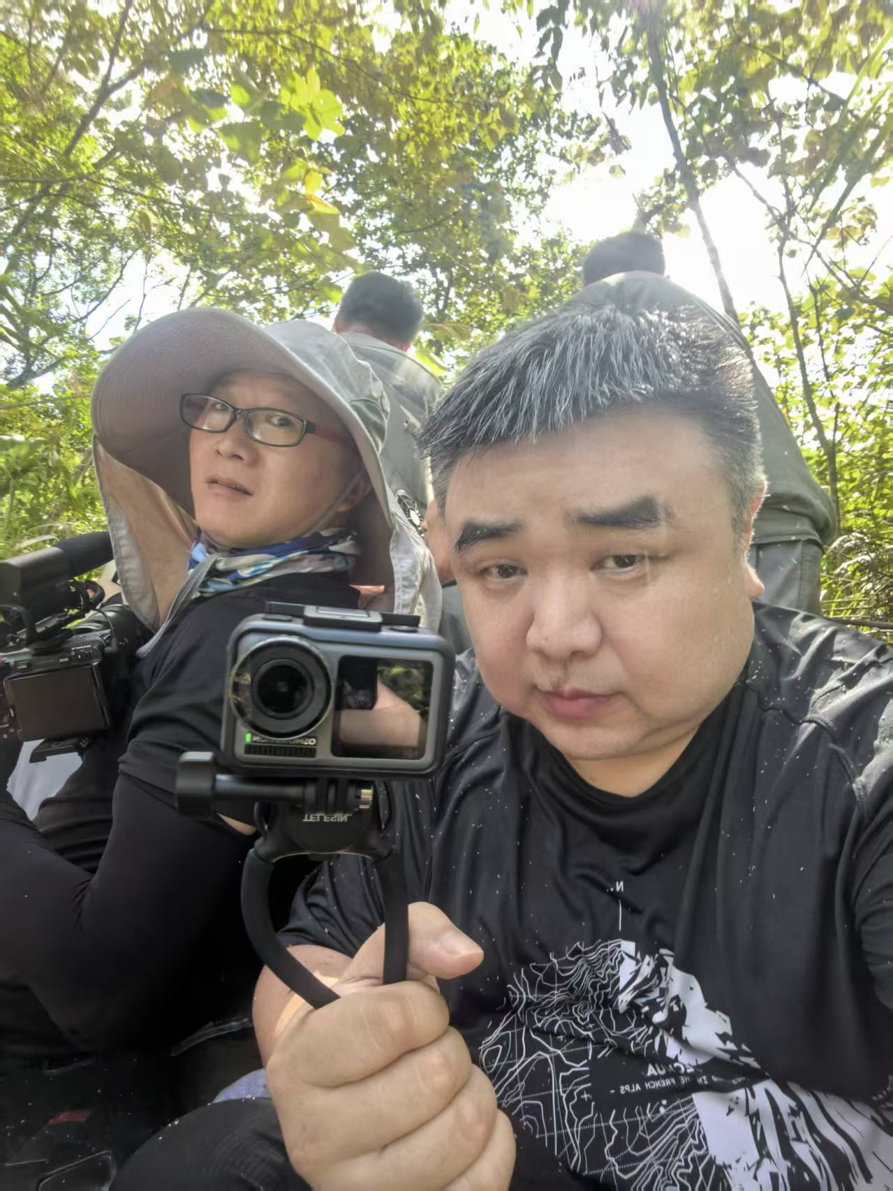 王小峰回忆,拍摄恰逢汛期,云开山的行程尤为艰险:团队乘越野车在盘山路上颠簸1.5小时,再背着沉重设备徒步穿越荆棘丛生的山林,湿滑泥泞的山路让成员屡屡滑倒,30°的采莨山坡更是步步惊心。但他们始终护着设备、相互搀扶,不仅记录下采莨人的艰辛,更见证了他们“挖大留小”的生态坚守,即便挖出小薯莨也重新埋入土壤,为香云纱产业留下可持续发展的根基。这份对自然的敬畏,让每一帧画面都饱含温度。