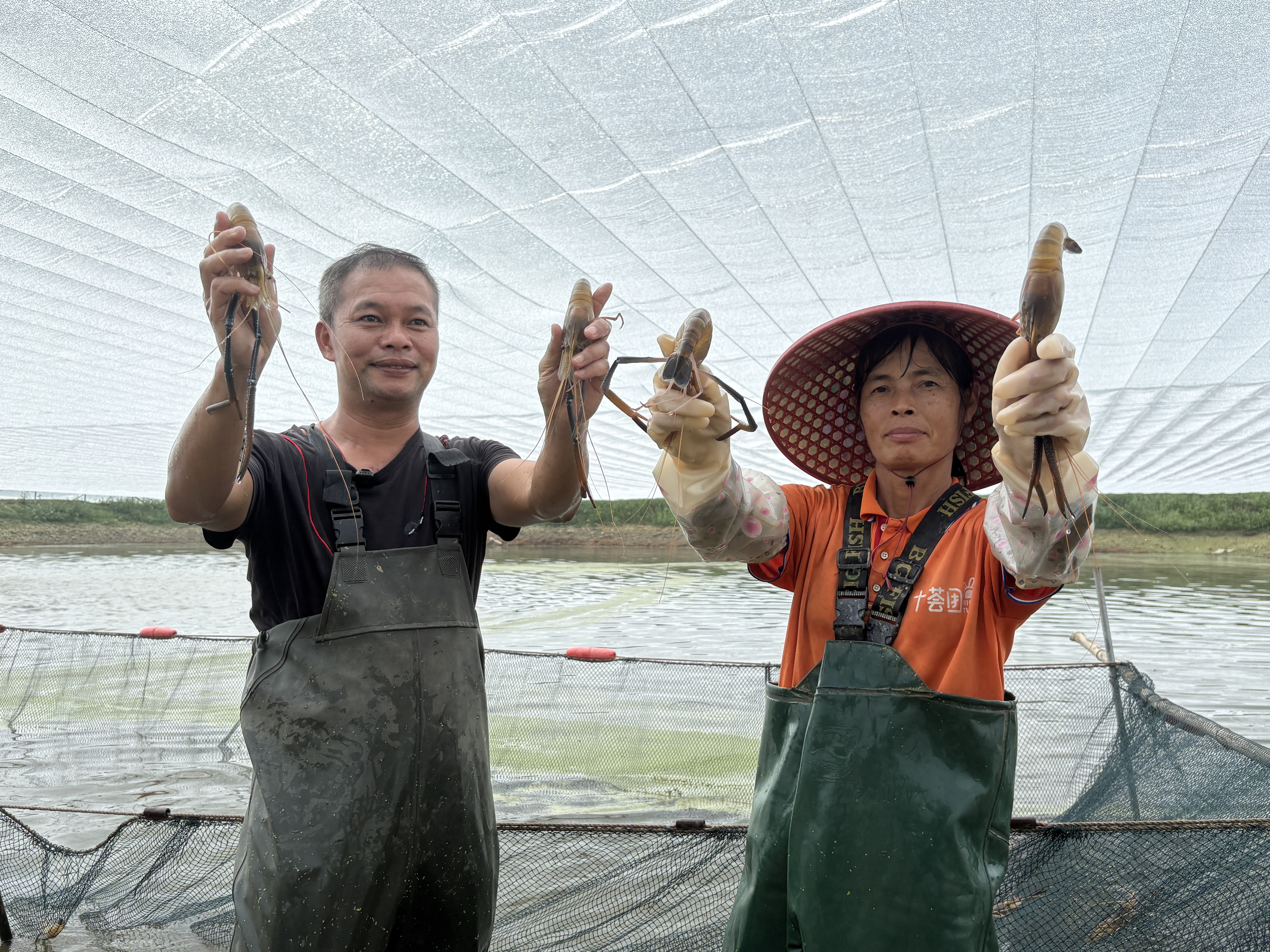 “壳薄、肉肥、膏满,是上等货!”经销商冯姐一边查看虾的成色,一边赞不绝口。她已是这里的常客,“这里的虾品质好,我年年都来收。”她解释说,罗氏虾在广东颇受青睐,因其大钳寓意“有钱”,也被亲切地称为“大头虾”。