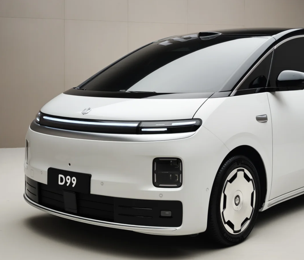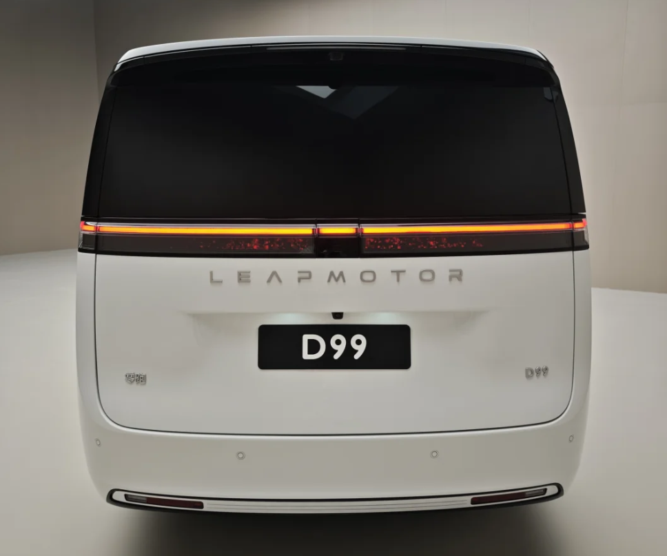 车身侧面,零跑D99采用短前悬,但拥有较长的后悬与轴距,银色的装饰勾勒出新车车窗的线条,后排侧滑门尺寸更大,上下车更加方便,同时采用隐藏式滑轨设计。新车配备19英寸的“向往之境”饼型轮圈及米其林静音轮胎。尺寸方面,新车的车身长度超5.2米,车宽接近2米,而轴距则是超过3.1米,具体的车身数据尚未公布。车尾方面,零跑D99在D柱位置设计有哑光饰板,尾灯则应用时下流行的贯穿式设计,灯组内部还集成有ISD交互灯幕,支持多种灯语。后包围底部配有贯穿式的哑光银色饰条,与前脸的设计语言形成呼应。