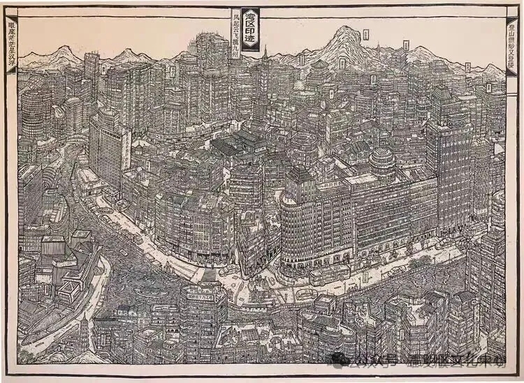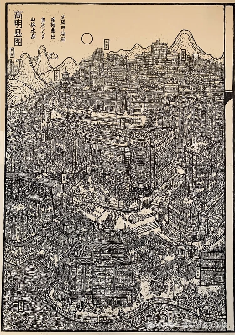 《盛世印记》与《湾区印迹》是一组以“时代记录”为核心的系列创作。前者以高明本土为视角,通过地标与人物刻画,展现小城在新时代的成长与温度;后者则将视野扩展至粤港澳大湾区,以现代都市与岭南传统的交融,呈现区域发展的宏大格局。两幅作品均运用版画独特的刀痕语言,构建出兼具历史厚度与时代锐度的视觉叙事,实现了从“地方记忆”到“时代叙事”的艺术升华。