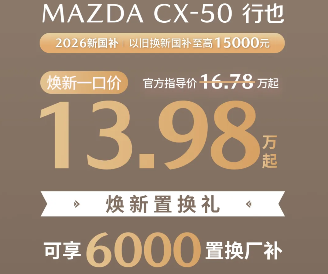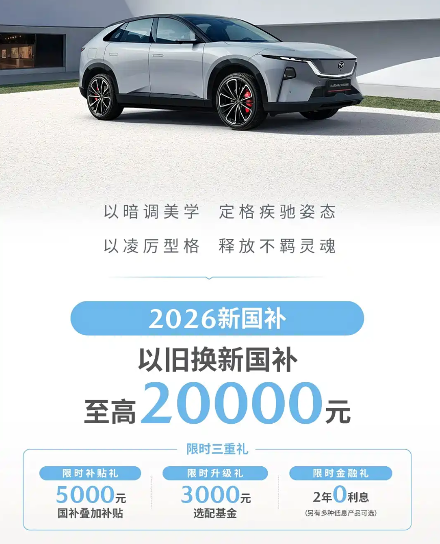 长安马自达官宣,针对旗下两款车型推出限时优惠,其中马自达CX-50行也焕新一口价13.98万起,而马自达EZ-60运动版至高可享以旧换新国补20000元。