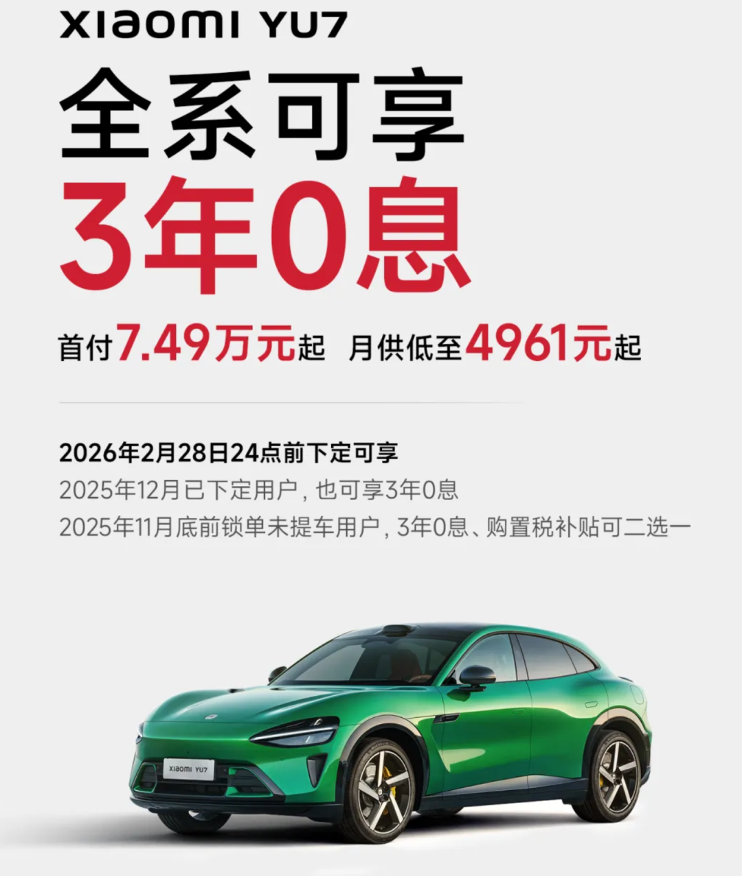小米汽车针对旗下两款车型推出多项购车权益,包含小米YU7以及小米SU7 Utrla。具体如下:小米YU7全系可享3年0息,首付7.49万元起,月供低至4961元起,2月28日24点前下定即可享受。同时,2月底前下定YU7,可享48000元限时购车权益。此外,预约试驾送合金车模,邀请好友锁单可获8000积分。用户在2月28日24点前下定小米SU7 Ultra可享购车权益包括:碳纤维运动方向盘+碳纤维中控台饰板+碳纤维前排座椅背板免费送;五年基础保养免费送;Xiaomi HAD 端到端辅助驾驶终身免费使用权。