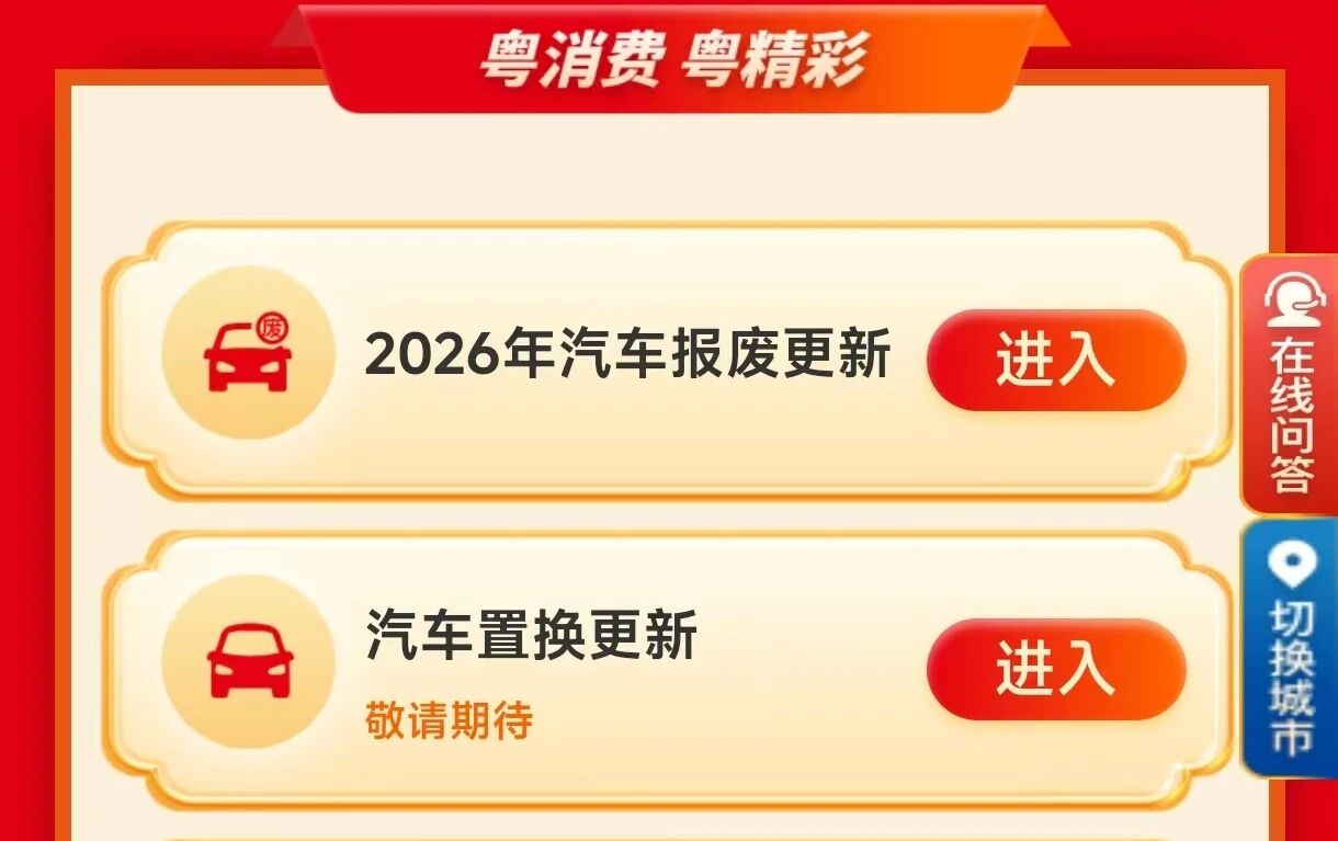 2026年1月1日起,通过报废更新或置换更新方式在佛山市购买符合条件的汽车,可分档分类给予一次性补贴。2026年汽车置换更新补贴申报入口将于近期开放,敬请期待。